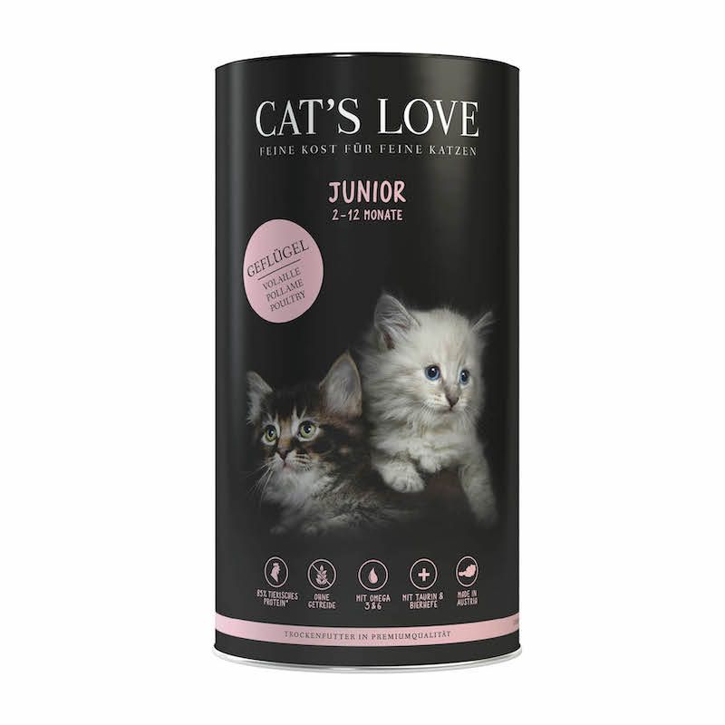 Die CAT'S LOVE Junior Linie für Katzen im Alter von 6 Wochen bis 12 Monaten beinhaltet speziell auf die Bedürfnisse von Katzen im Wachstum abgestimmte Nährstoffe. So sorgt z.B. natürliches Eierschalenpulver für einen hohen Kalziumgehalt, der für starke Knochen und gesunden Wachstum sorgt. Der Proteingehalt ist ideal angepasst an den hohen Energiebedarf von Jungkatzen und Kitten.