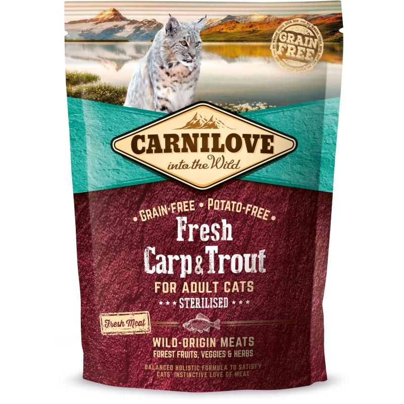 Katzen sind einzigartige und unabhängige Lebewesen, die als Fleischfresser Raubtiere sind und deren Lebensweise von einem starken Jagdinstinkt bestimmt wird. Carnilove Fresh Meat mit Karpfen und Forelle wurde mit Respekt für die Gesetze der Natur zusammengestellt und bietet Ihrer Katze eine ausgewogene Ernährung, die reich an frischem Fisch und Meeresfrüchten ist und die mit einer Vielzahl von Gemüsearten, Beeren und Kräutern kombiniert sind. Der kontrollierte Gehalt an Mineralstoffen unterstützt die einwandfreie Funktion der Nieren und des Harntrakts, wobei die aus Früchten und Kräutern erhaltenen natürlichen Antioxidantien reinigende und entzündungshemmende Eigenschaften aufweisen. Die Rückkehr zu einer natürlichen Nahrung hält sterilisierte Katzen in einem hervorragenden physischen Zustand.