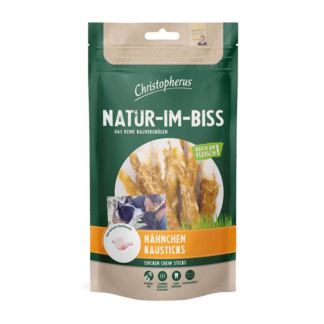Die Christopherus Natur-Im-Biss Hähnchen-Kausticks Hähnchenfilet und Rinderrohhaut sind eine natürliche und leckere Belohnung für deinen Hund.