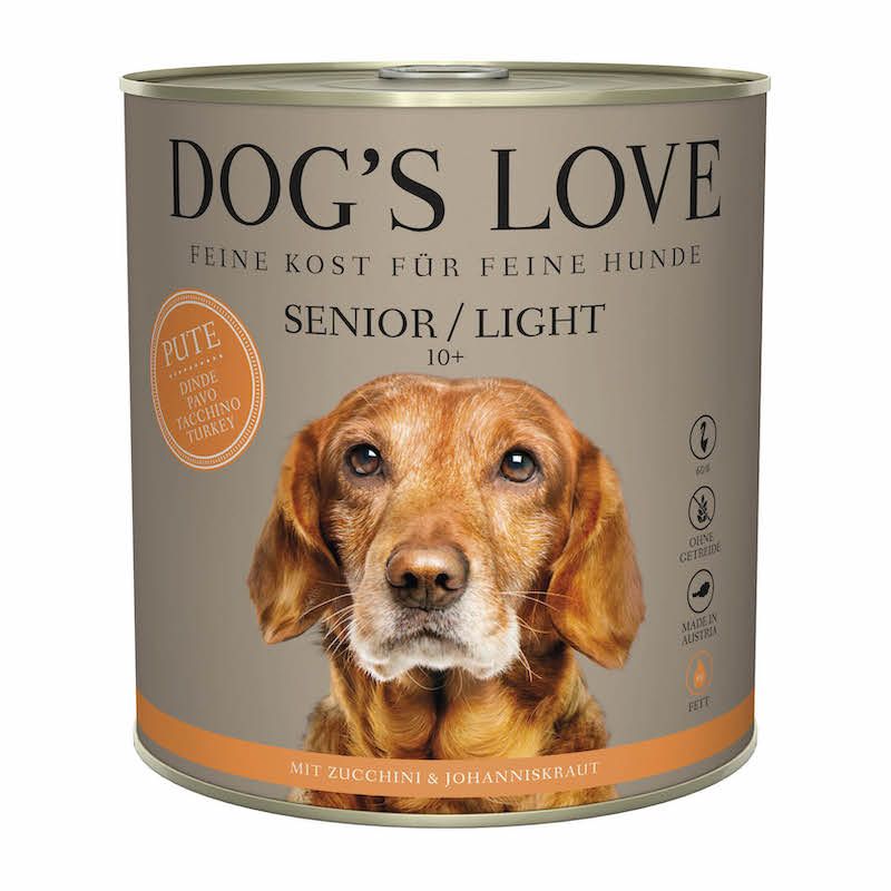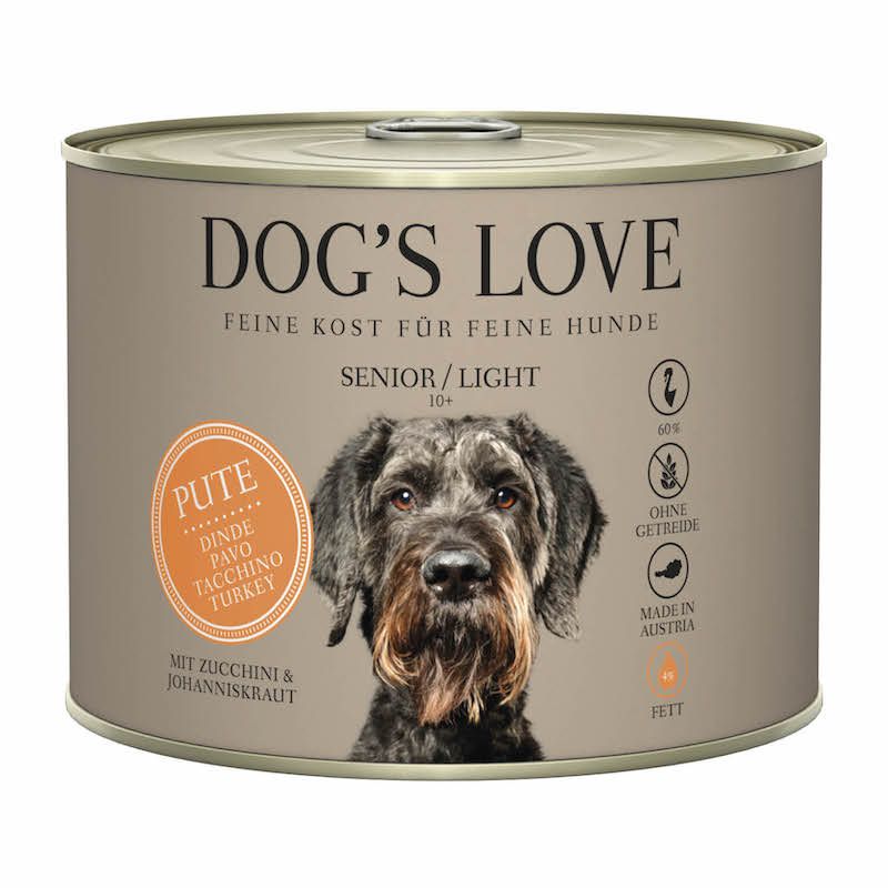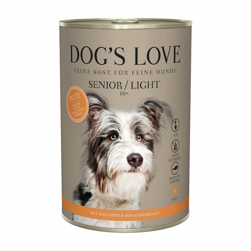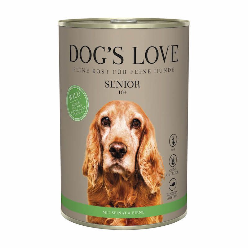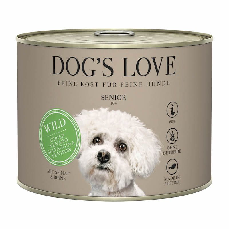 Natürliches Alleinfuttermenü in 100 % Lebensmittelqualität mit 60 % Fleischanteil, viel frischem Gemüse und Obst für Hunde ab zehn Jahren. Die DOG'S LOVE Senior Menüs sind optimal an den Nährstoffbedarf älterer Hunde angepasst und auch für ernährungssensible Hunde geeignet.