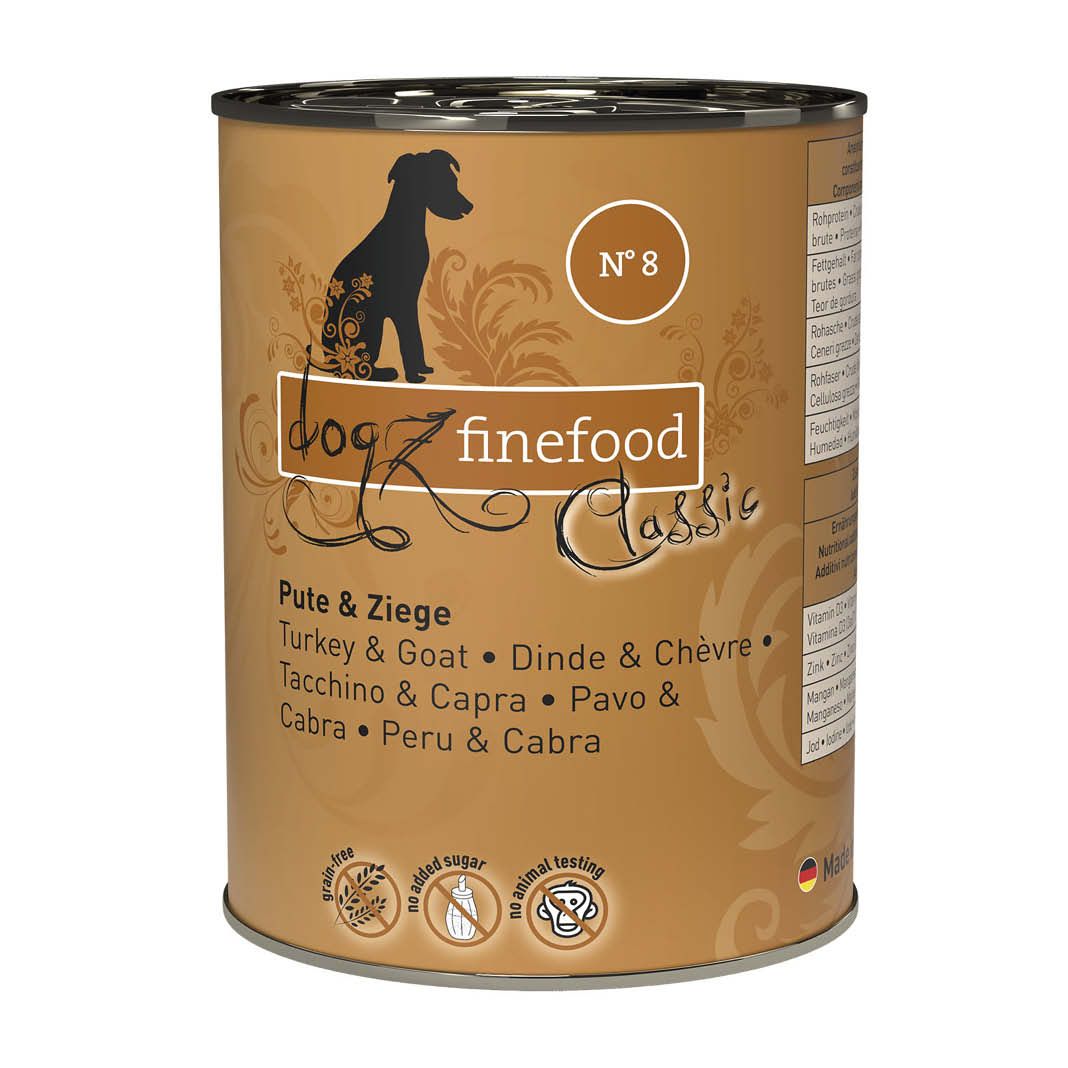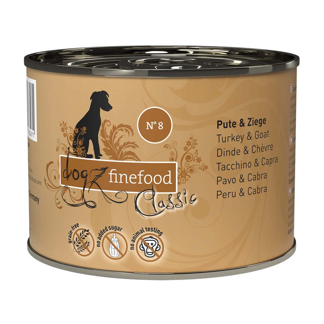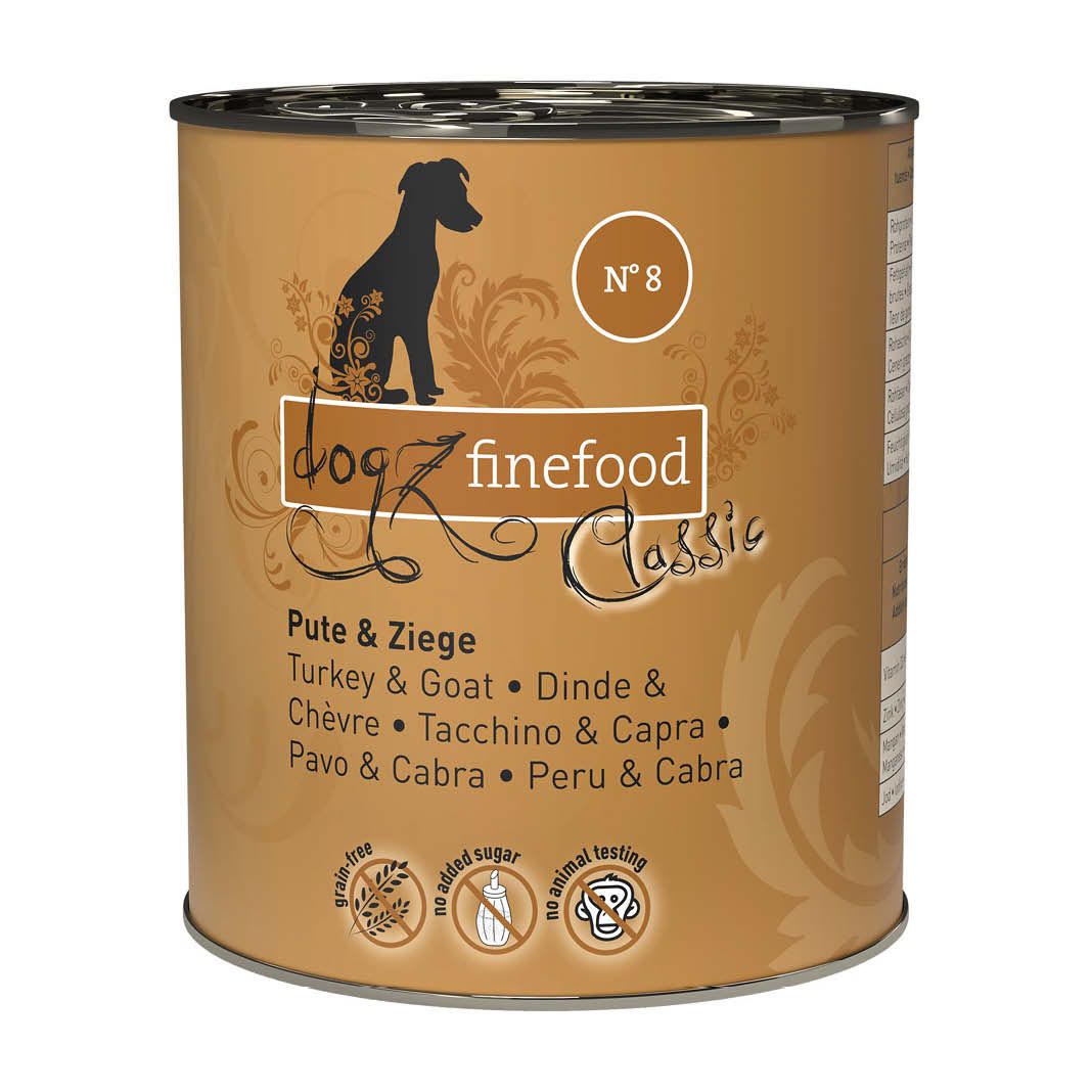 Pute 45 % (bestehend aus Muskelfleisch, Herz, Leber und Hälsen), Trinkwasser 25,7 %, Ziege 20 % (bestehend aus Leber, Herz und Lunge), Amarant 4 %, Cranberries 4 %, Mineralstoffe 1 %, Sonnenblumenöl 0,2 %, Rosmarin 0,1%
