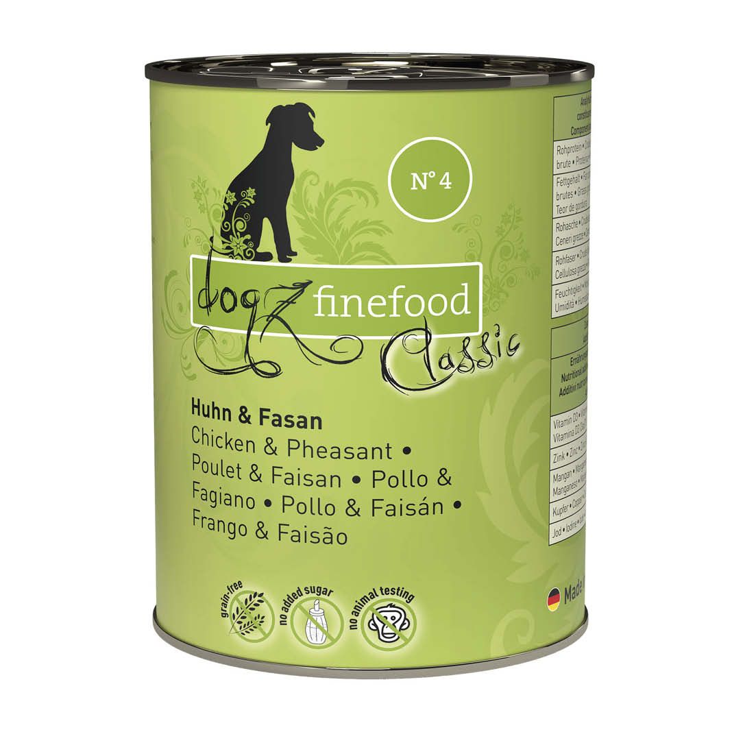 Huhn 50 % (bestehend aus Muskelfleisch, Herz, Leber, Magen und Hals), Trinkwasser 25,7 %, Fasan 15 %, Quinoa 3 %, Kürbis 3 %, Heidelbeeren 2 %, Mineralstoffe 1 %, Rapsöl 0,2 %, Kresse 0,1%