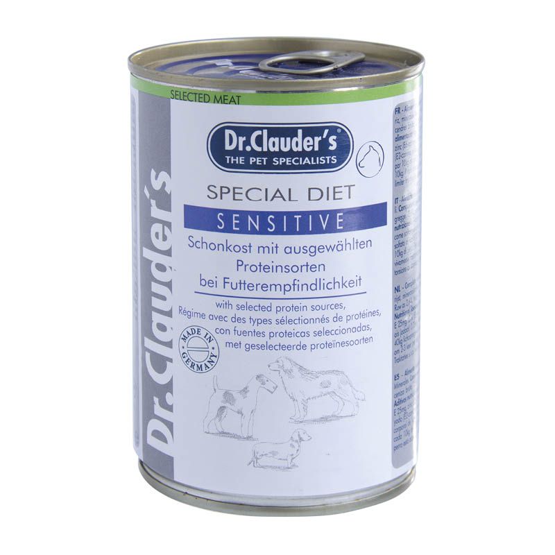 Dr. Clauder's Sensitive Schonkost mit ausgewählten Proteinsorten. Diese Schonkost wurde für Hunde mit Empfindlichkeit gegenüber bestimmten Futtermittelrohstoffen entwickelt. Anders als bei der üblichen Vollnahrung wurde nur je eine Quelle für tierisches und pflanzliches Eiweiß gewählt. Lamm und Reis haben sich bei Futterempfindlichkeit bewährt. Auf die Zugabe von Schwein, Rind und Weizen wurde aus diesem Grund verzichtet. Hunde mit akuten Problemen sollten dem Tierarzt vorgestellt werden.