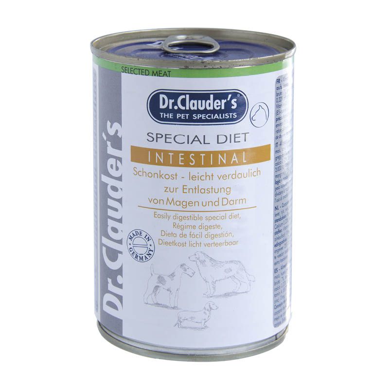 Dr. Clauder's Intestinal Schonkost leicht verdaulich. Hunde, die durch Krankheiten oder operative Eingriffe geschwächt sind, benötigen eine besonders gut verträgliche Kost, die Magen und Darm wenig belastet. Auf Huhn und Reis aufgebaute Nahrung hat sich in diesen Fällen als besonders geeignet erwiesen. Hiermit steht den Hunden eine schonende Vollkost aus leicht verdaulichen Rohstoffen und mit reduziertem Fettgehalt zur Verfügung. Geschwächte Hunde und Hunde mit Magen und Darmempfindlichkeit können so schonend ernährt werden.