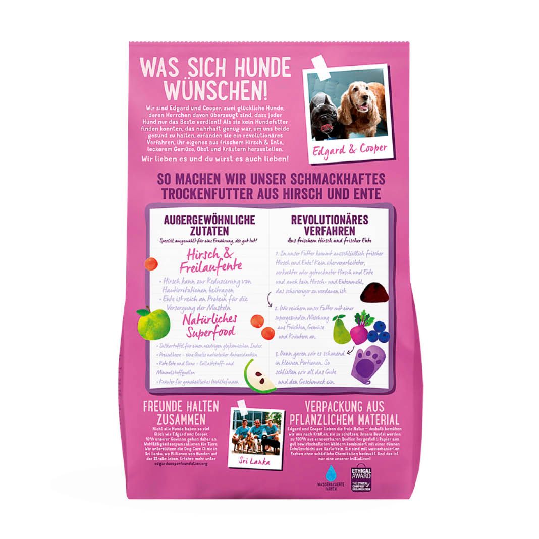 Dieses Trockenfutter mit frischem Wild und Freiland Ente liefert hochwertiges Protein (ohne getrocknetes oder dehydratisiertes Fleisch). Es ist hypoallergen und daher perfekt für ernährungssensible Hunde. Es enthält außerdem Präbiotika für einen gesunden Darm, sowie Süßkartoffel als Kohlenhydratquelle. Edgard & Cooper mischt das Trockenfutter mit einem super gesunden Mix aus Obst und Gemüse, sowie einer extra Portion gesunder Kräuter. Dann wird es schonend gegart, um den Geschmack zu erhalten.