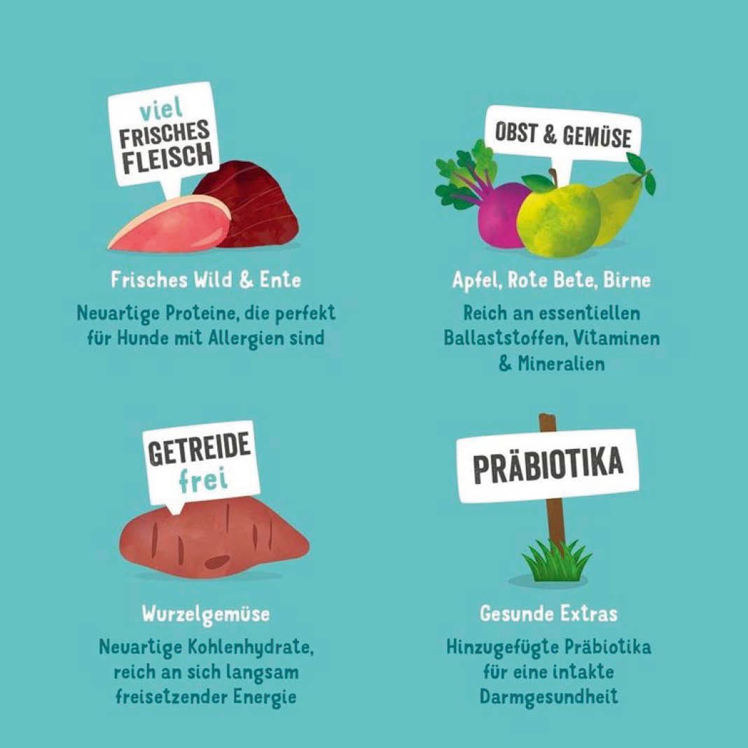frische Ente 35%, Süßkartoffeln 22%, Erbsen, Erbsenprotein, frischer Hirsch 5%, Fischöl, Entensoße, Leinsaat, Mineralstoffe, Kräuter 0,2% (Ringelblumenblüten, Nesseln, Brombeerblätter, Fenchel, Kümmel, Kamille, Melisse), Mannan-Oligosaccharide (MOS), Fructo-Oligosaccharide (FOS), Äpfel 0,04%, Rote Bete 0,04%, Birnen 0,04%, Blaubeeren 0,04%, Preiselbeeren 0,04%.