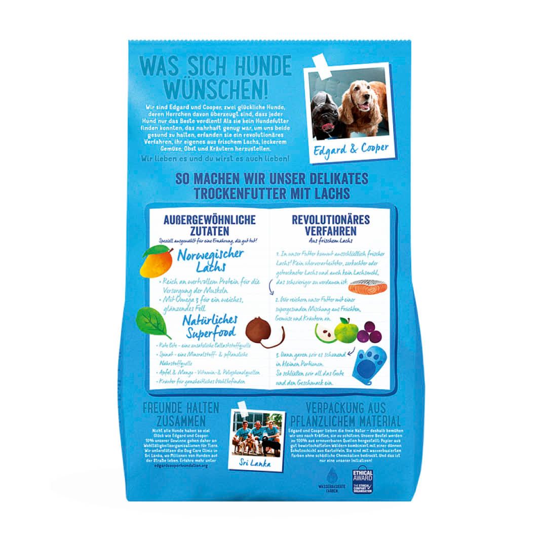 Reich an frischem norwegischen Lachs, ist diese getreidefreie Rezeptur voll an hochwertigem Protein und Omega-3 (ohne dehydratisierten Fisch). Dieses Futter ist hypoallergen (also perfekt für empfindliche Mägen) und enthält Präbiotika für einen gesunden Darm. Edgard & Cooper mischt dieses Trockenfutter mit einem super gesunden Mix aus Obst und Gemüse, sowie einer extra Portion gesunder Kräuter. Dann wird es schonend gegart, um den Geschmack zu erhalten.