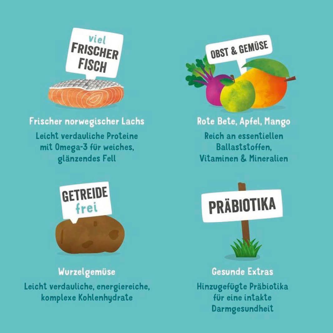 frischer Lachs 40%, Kartoffel, Erbsen, Erbsenprotein, Leinsaat, Fischöl, vegetarische Soße, Mineralstoffe, Kräuter 0,2% (Ringelblumenblüten, Nesseln, Brombeerblätter, Fenchel, Kümmel, Kamille, Melisse), Mannan-Oligosaccharide (MOS), Fructo-Oligosaccharide (FOS), Rote Bete 0,04%, Äpfel 0,04%, Mango 0,04%, Avocado 0,04%, Kokosnuss 0,04%, Spinat 0,04%, schwarze Johannisbeeren 0,04%.