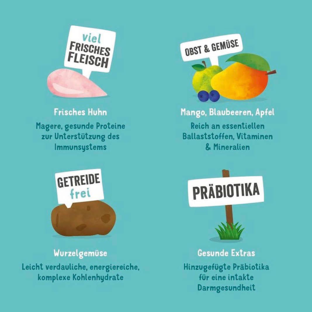 frisches Huhn 40%, Kartoffel, Erbsen, Erbsenprotein, Hühnerfett, Leinsaat, Hühnersoße, Mineralstoffe, Fischöl, Kräuter 0,2% (Ringelblumenblüten, Nesseln, Brombeerblätter, Fenchel, Kümmel, Kamille, Melisse), Mannan-Oligosaccharide (MOS), Fructo-Oligosaccharide (FOS), Mango 0,04%, Blaubeeren 0,04%, Äpfel 0,04%, Erdbeeren 0,04%, Karotten 0,04%, Tomaten 0,04%.