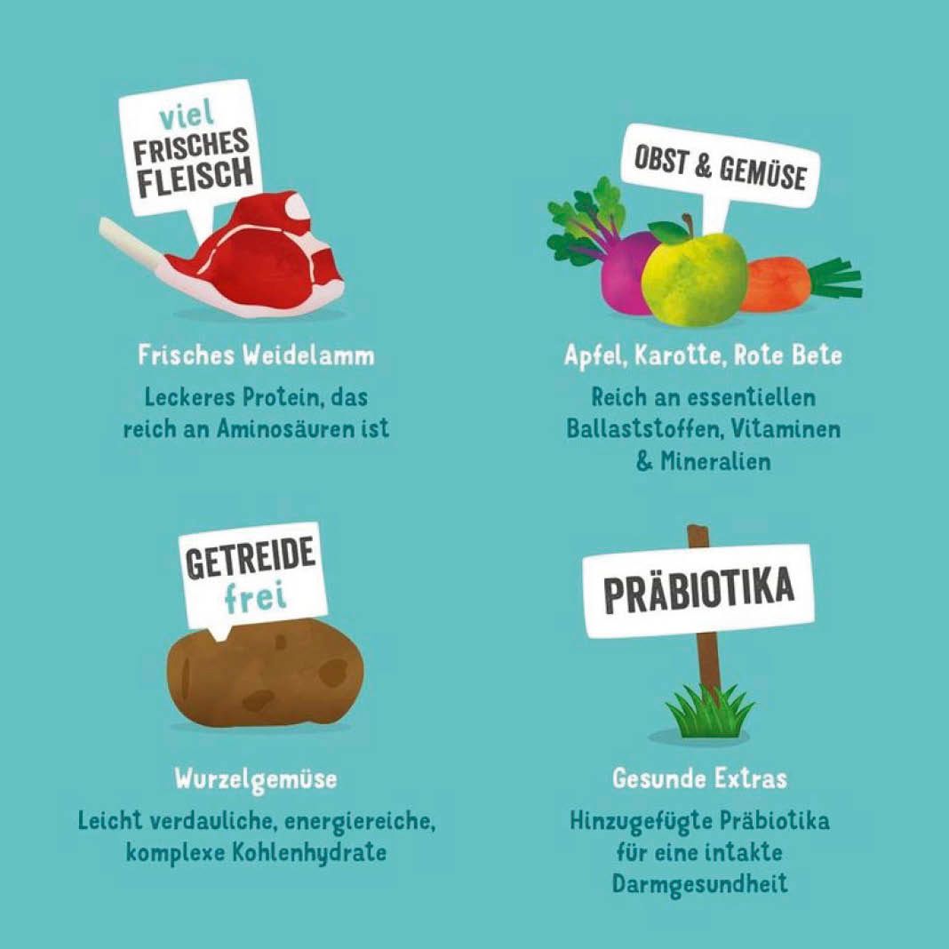 frisches Lamm 40%, Kartoffel, Erbsen, Erbsenprotein, Leinsaat, Lammsoße, Sonnenblumenöl, Mineralstoffe, Kartoffeleiweiß, Fischöl, Kräuter 0,2% (Ringelblumenblüten, Nesseln, Brombeerblätter, Fenchel, Kümmel, Kamille, Melisse), Mannan-Oligosaccharide (MOS), Fructo-Oligosaccharide (FOS), Karotten 0,04%, Äpfel 0,04%, Birnen 0,04%, Brokkoli 0,04%, Banane 0,04%, Grünkohl 0,04%, Spinat 0,04%, Rote Bete 0,04%, Blaubeeren 0,04%.