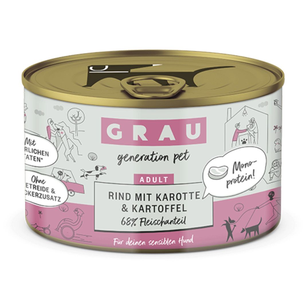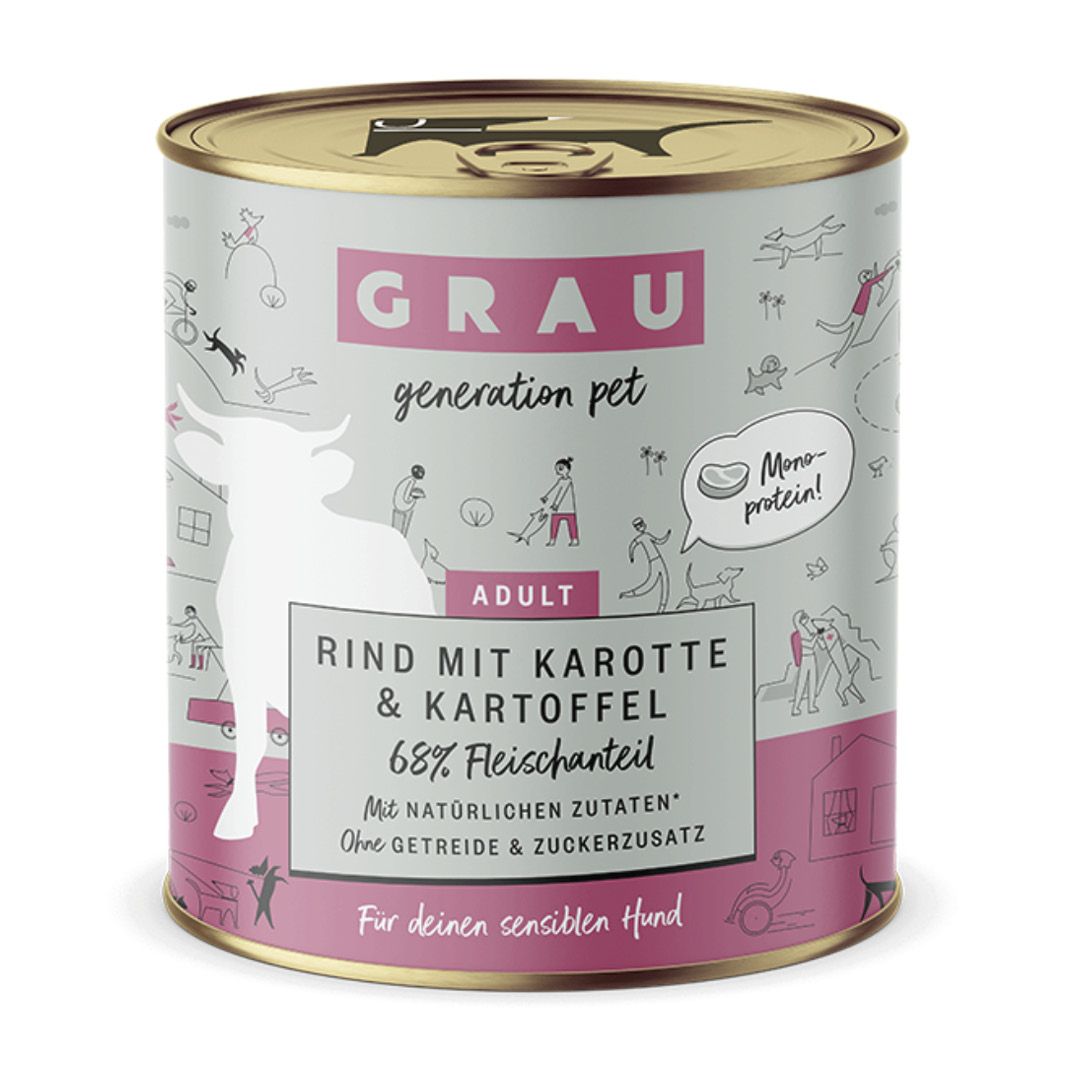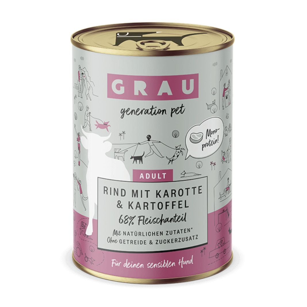 Dieses GRAU Menü ist getreidefrei: mit Rind als einziger tierischer Proteinquelle besonders geschmacksintensiv und versorgt deinen Hund mit einer ordentlichen Portion Eisen und Phosphor. Ergänzt wird dies durch die Kartoffel als Kohlenhydratquelle mit viel verwertbarem Protein sowie Ballaststoffen und Vitaminen. Die Karotte unterstützt zudem die Verdauung und Sehkraft.