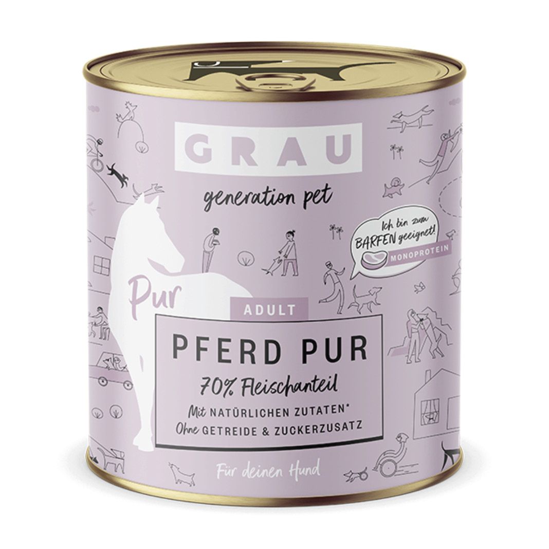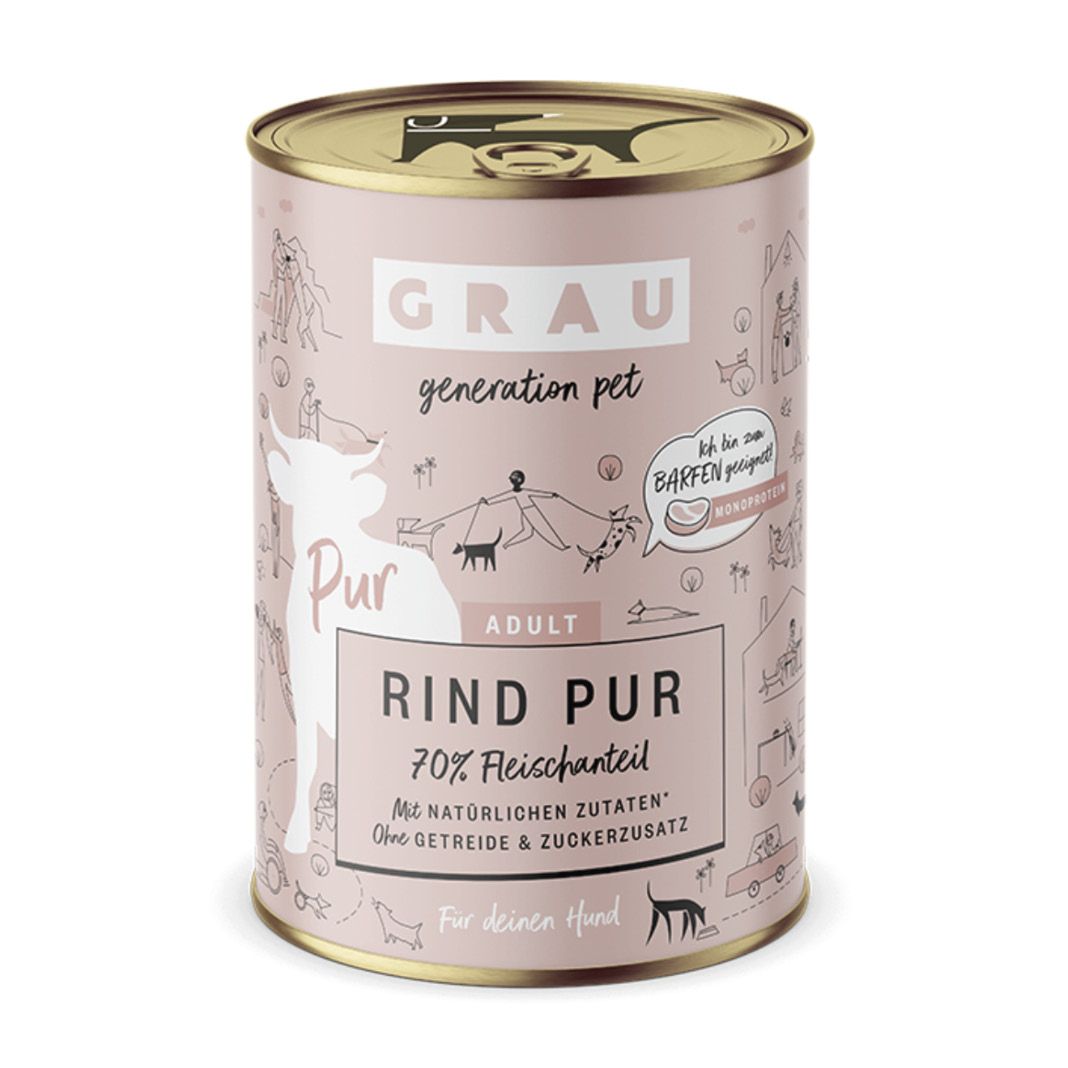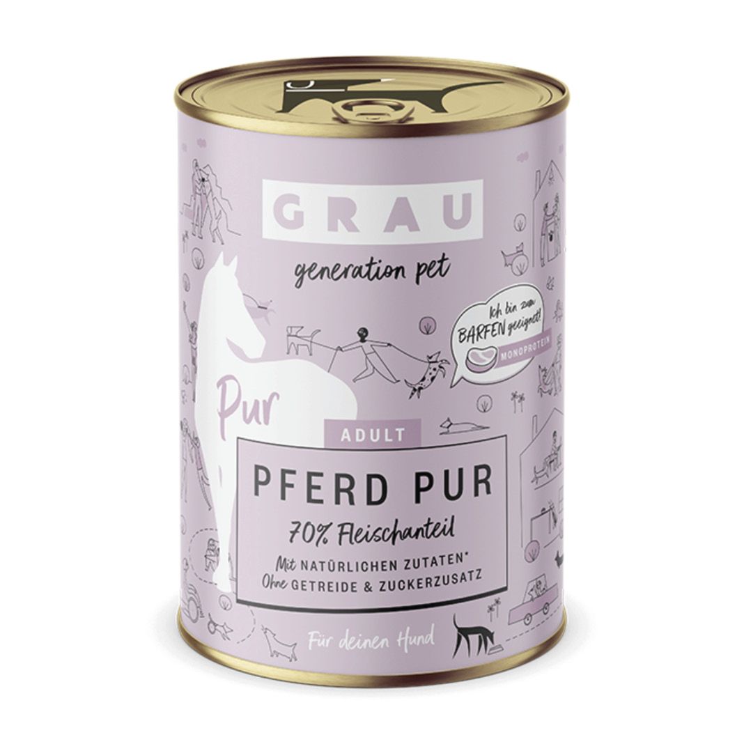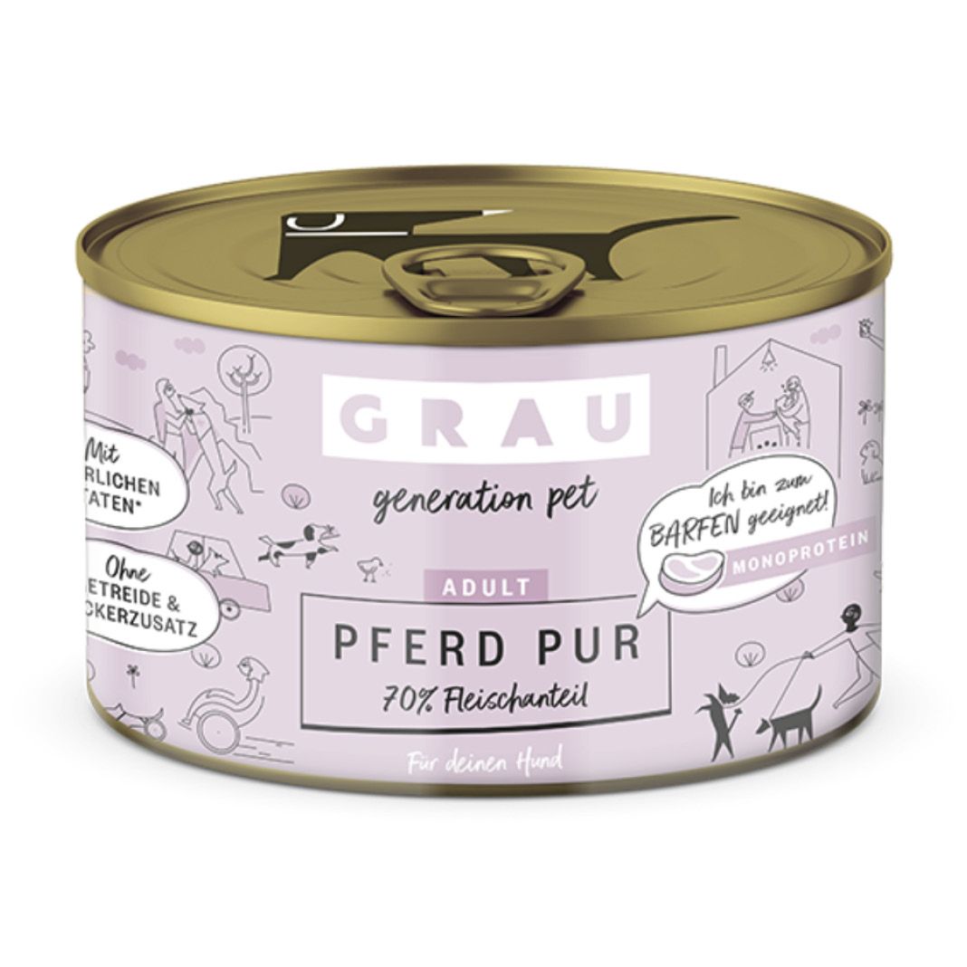 Bei den Pur-Sorten von GRAU kommt dem Familienunternehmen nur eins in die Dose: 70 % frisches Fleisch und das immer nur aus einer einzigen tierischen Proteinquelle. Damit sind sie perfekt geeignet, wenn dein Hund Unverträglichkeiten oder Allergien hat. Auch für ein BARF-Menü, eine selbstgemixte Mahlzeit mit unseren Ergänzungsflocken oder für eine Ausschlussdiät sind sie eine gute Wahl.