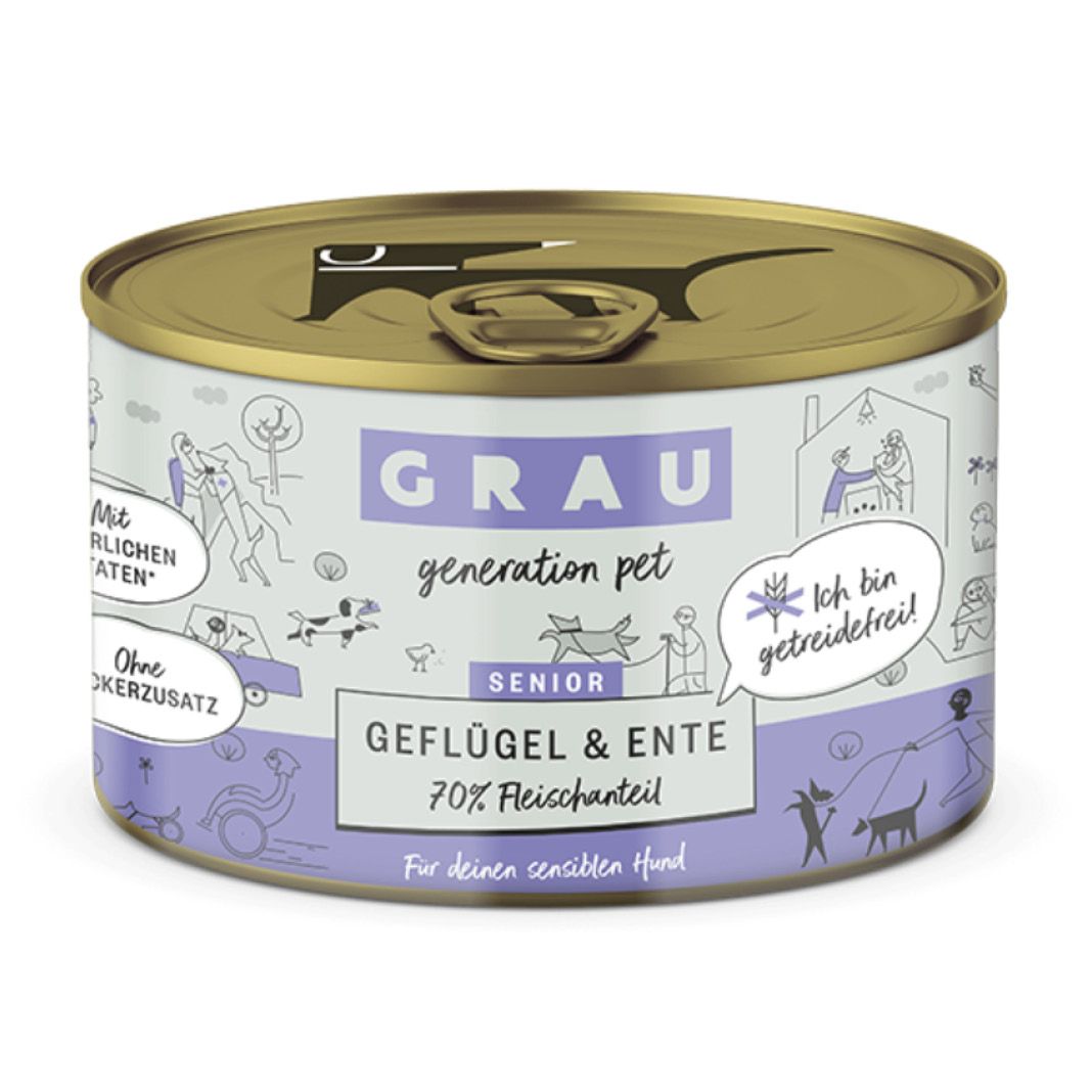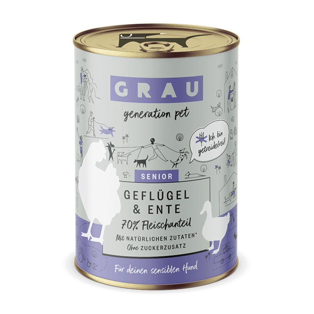 Dieses GRAU Menü ist perfekt für ältere Hunde: Die getreidefreie Kombination aus Ente und leicht verdaulichem Geflügel versorgt deine betagte Fellnase schonend mit allem, was sie benötigt und hat dabei einen niedrigen Protein- und Fettgehalt.