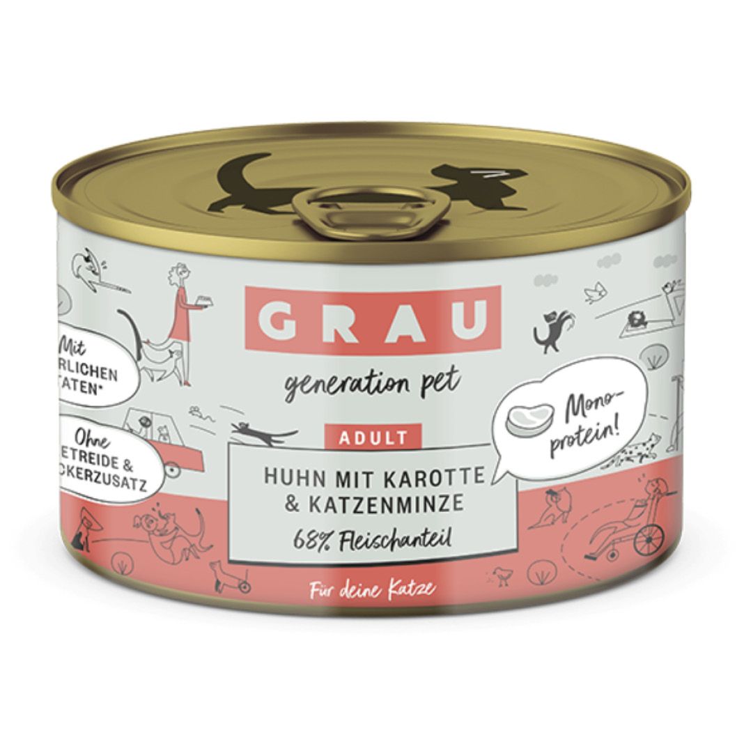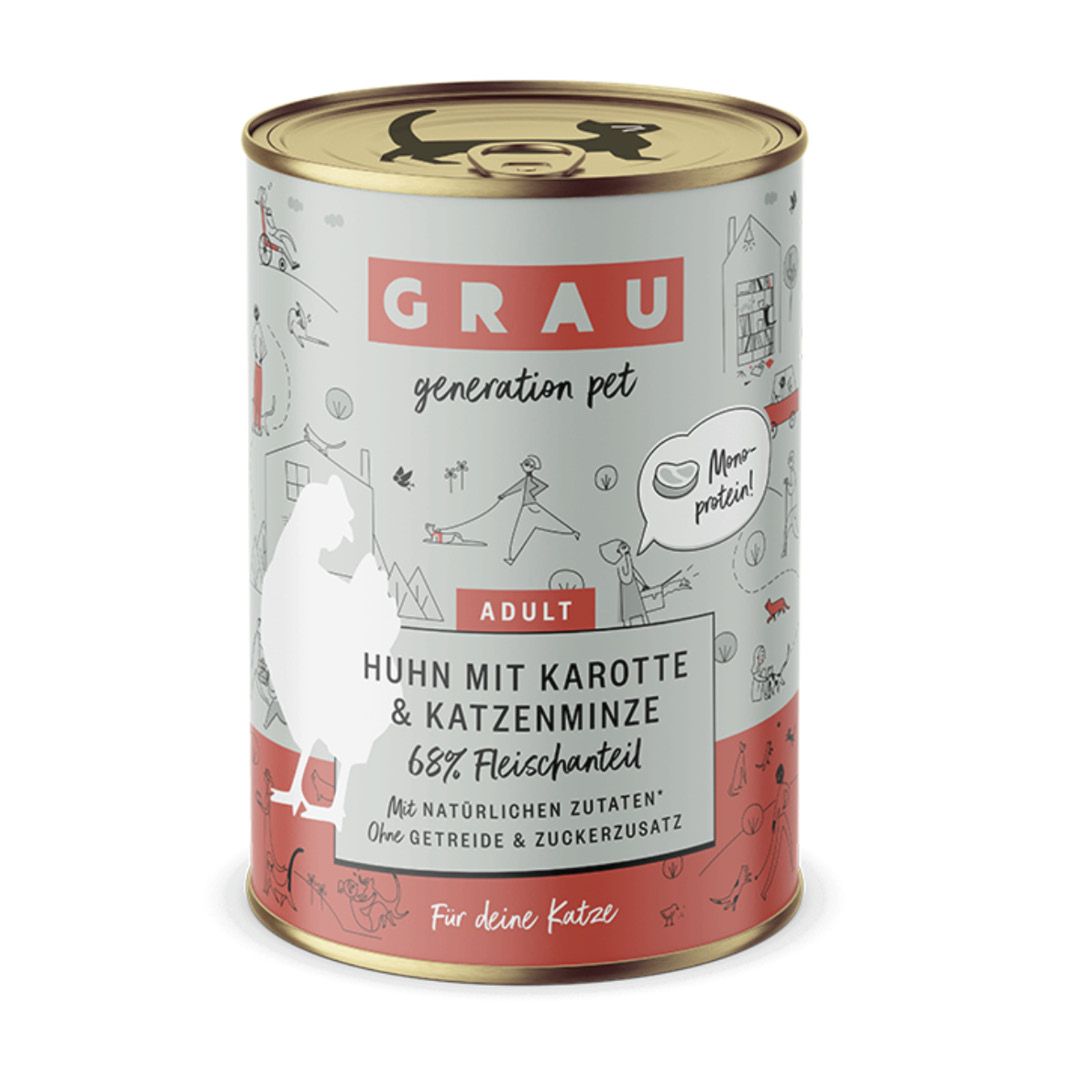 Huhn als einzige tierische Proteinquelle ist leicht verdaulich und daher eine gute Wahl für sensible Fellnasen. Karotte enthält viele Ballaststoffe, die eine gute Verdauung fördern und überdies eine gute Sehkraft unterstützen. Abgerundet wird dieses GRAU Menü durch Katzenminze: Viele Katzen lieben den Geschmack von Katzenminze, weshalb sie auch mäkelige Katzen überzeugt.