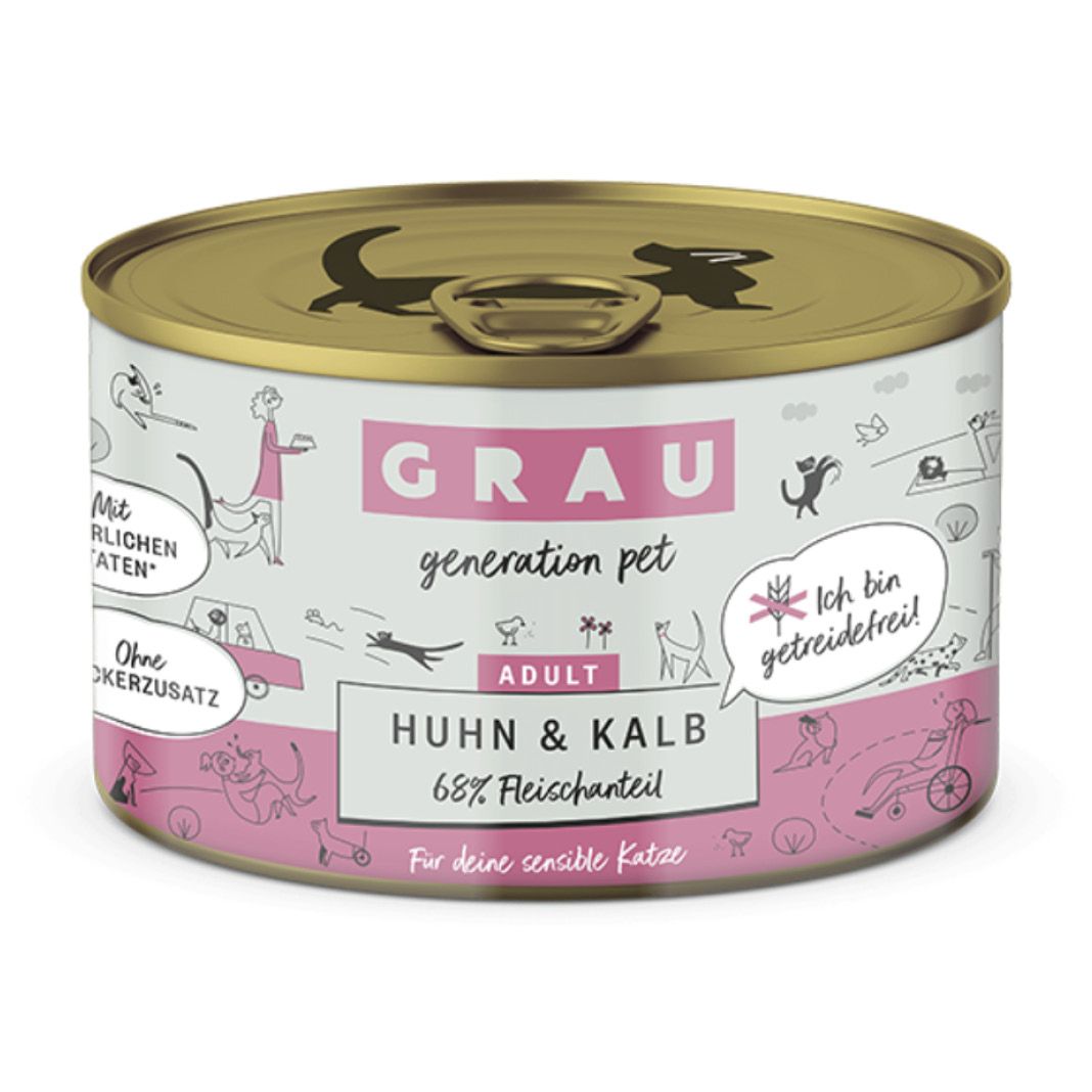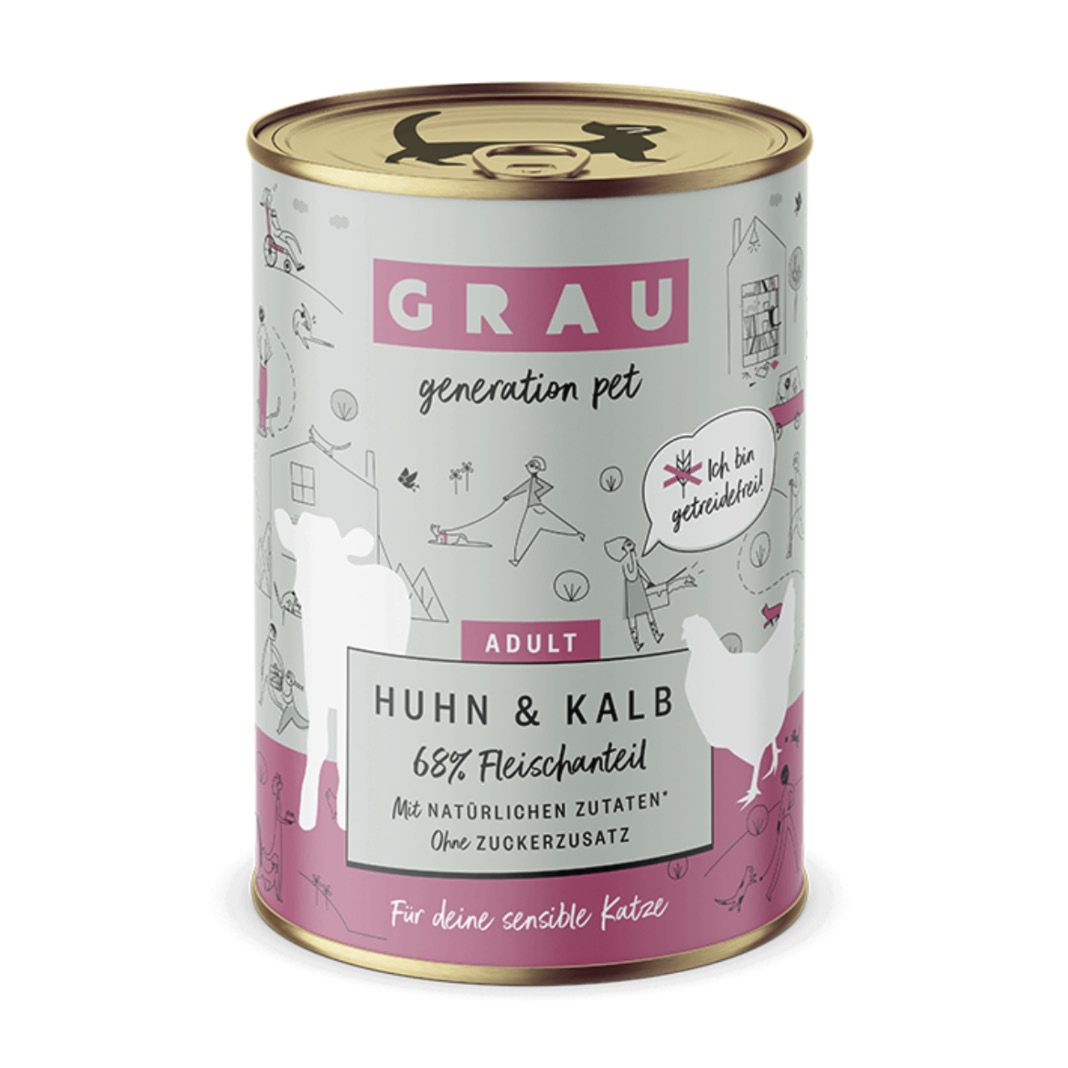 Das GRAU Menü-Duo aus Huhn und Kalb ist gut verdaulich und reich an Vitaminen. Huhn ist besonders bekömmlich und eine magere Proteinquelle mit einer Extraportion an B-Vitaminen. Kalbfleisch liefert ebenso viele Proteine und versorgt deine Katze mit wichtigen Vitaminen und Spurenelementen, wie Zink und B-Vitaminen.