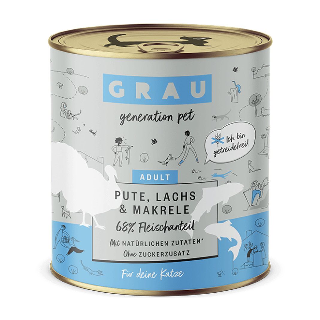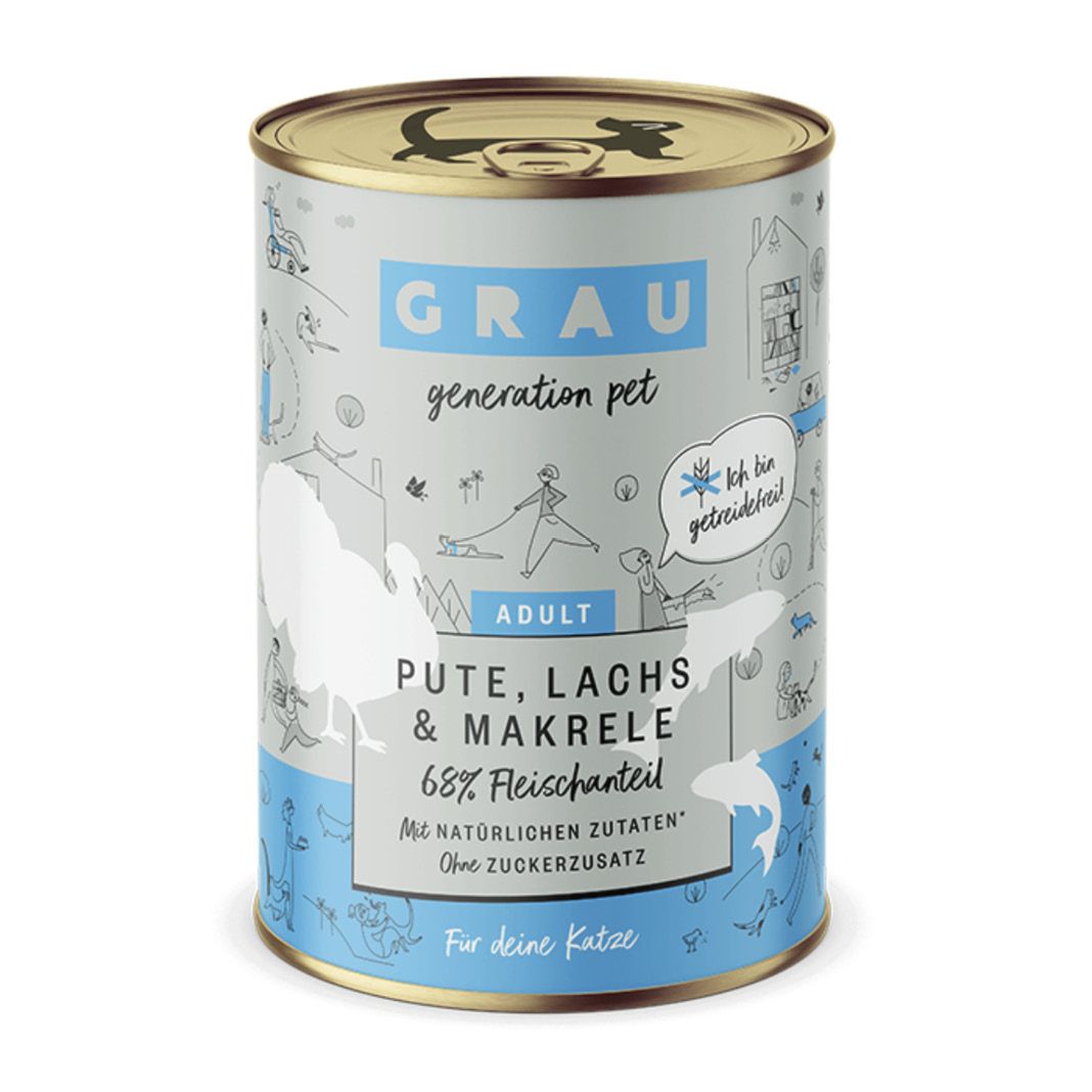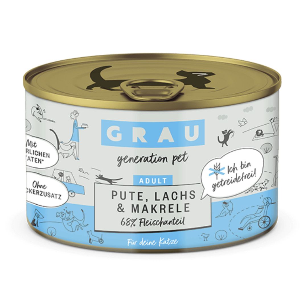 Das ausgewogene GRAU Menü-Trio aus Pute, Lachs & Makrele ist besonders schmackhaft und nicht nur für Fischliebhaber ein echter Gaumenschmaus. Lachs und Makrele sind besonders reich an natürlichen Omega-3- und Omega-6-Fettsäuren und unterstützen so Haut und Fell deiner Katze. Das Putenfleisch versorgt deine Samtpfote mit einer ordentlichen Portion Proteinen und ist dabei leicht verdaulich.