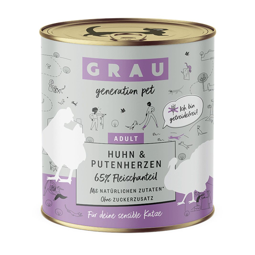 Dieses getreidefreie GRAU Menü-Duo punktet mit einem hohen Fleischanteil. Huhn steckt voller B-Vitamine und ist als wertvolle Proteinquelle gut verdaulich. Putenherzen bestehen aus reinem Muskelfleisch und werten mit einer Extraportion Proteine das Mahl deiner Samtpfote auf. Obendrauf sind sie praktisch fettfrei.