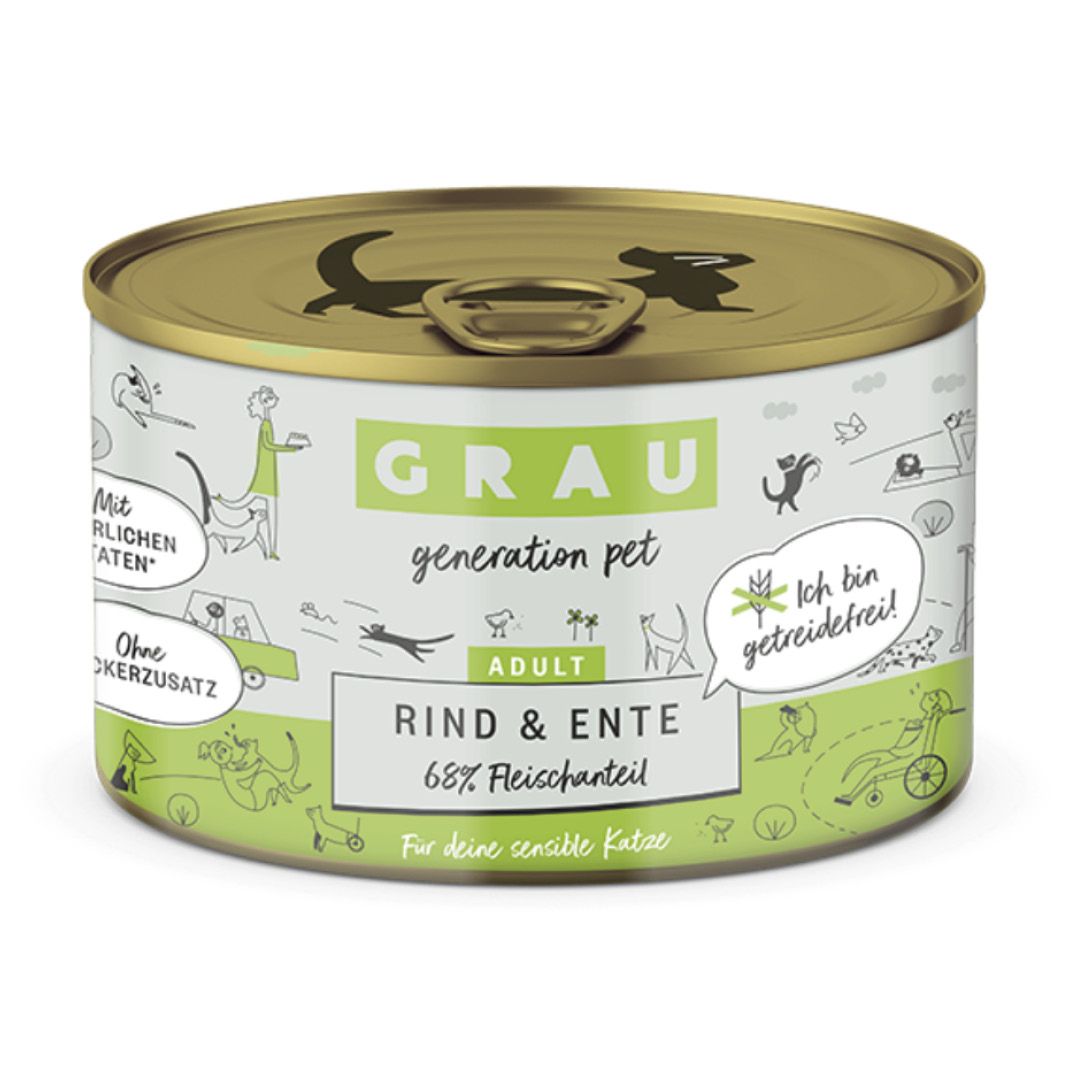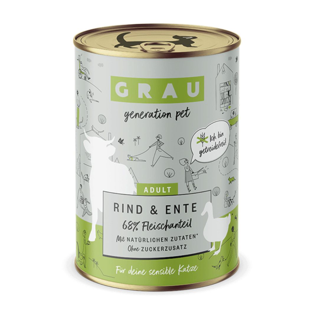 Dieses GRAU Menü-Duo punktet als getreidefreie Variante mit hohem Fleischanteil. Rind und Ente schmecken in Kombination sehr intensiv und machen das Menü so zu einem ganz besonderen Gaumenschmaus. Rindfleisch versorgt deine Katze mit ordentlich Eisen und Phosphor. Zudem ist es sehr proteinreich und vergleichsweise fetthaltig, weshalb es auch aktive Katzen mit genügend Energie versorgt. Ente überzeugt zudem mit einem hohen Gehalt an Eiweiß, Magnesium und Vitamin B1.