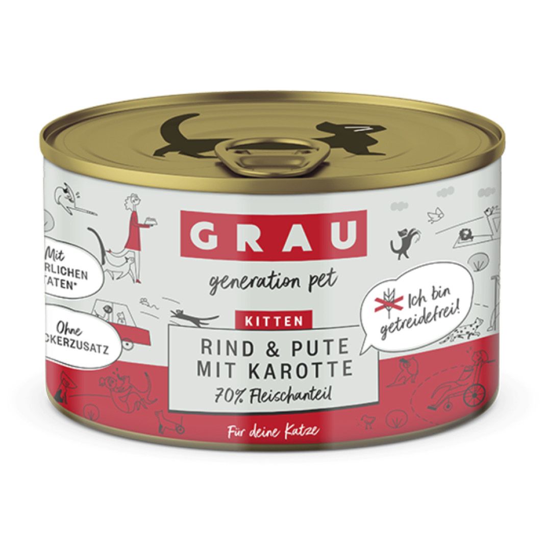 Die ausgewogene Kombination aus Rind- und Putenfleisch mit Gemüse macht dieses Grau Menü-Trio besonders protein- und vitaminreich. Das enthaltene Eierschalenpulver ist eine natürliche Quelle für Kalzium, das den erhöhten Bedarf deines Kitten für starke Knochen, Zähne und Krallen abdeckt. Karotte enthält viele Ballaststoffe, die eine gute Verdaaung fördern und überdies zu einer guten Sehkraft beitragen. So ist das Futter der perfekte Begleiter bis zum Ende der Wachstumsphase.