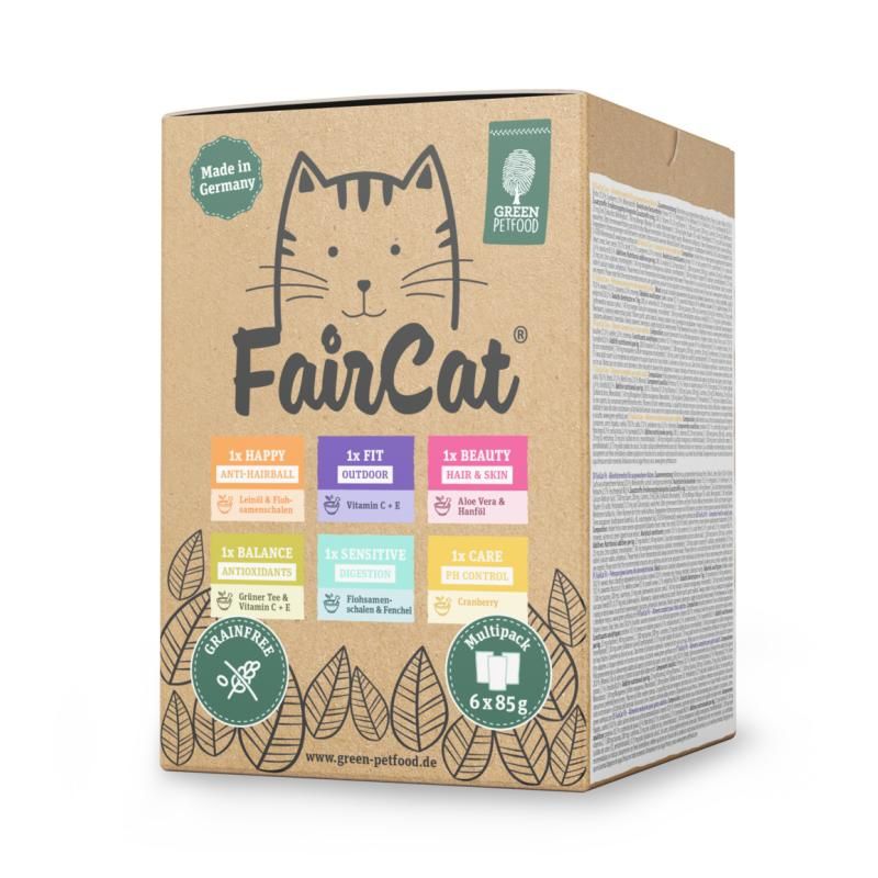 FairCat Happy: Hühnchen aus artgerechterer Haltung 70,0% (Herz, Fleisch, Leber, Hälse); Brühe; Mineralstoffe;Cellulose; Leinöl 0,50%; Flohsamenschalen 0,10%.FairCat Beauty: Hühnchen aus artgerechterer Haltung 50,0% (Herz, Fleisch, Leber, Hälse); Brühe; Lachsaus artgerechterer Haltung 20,0 %; Mineralstoffe; Lachsöl; Hanföl 0,20%; Aloe Vera 0,20%.FairCat Balance: Hühnchen aus artgerechterer Haltung 70,0% (Herz, Fleisch, Leber, Hälse); Brühe; Mineralstoffe;Grüner-Tee Extrakt 0,10%.FairCat Care: Hühnchen aus artgerechterer Haltung 70,0% (Herz, Fleisch, Leber, Hälse); Brühe 27,0%;Cranberry 2,00%; Mineralstoffe.FairCat Fit: Hühnchen aus artgerechterer Haltung 50,0% (Herz, Fleisch, Leber, Hälse); Brühe; Lachsaus artgerechterer Haltung 20,0 %; Mineralstoffe; Lachsöl; Grünlippmuschelextrakt.FairCat Sensitive: Hühnchen aus artgerechterer Haltung 70,0 % (Herz, Fleisch, Leber, Hälse); Brühe; Mineralstoffe;Lachsöl; Fructo-Oligosaccharide; Mannan-Oligosaccharide; Fenchel 0,10%; Flohsamenschalen 0,10%