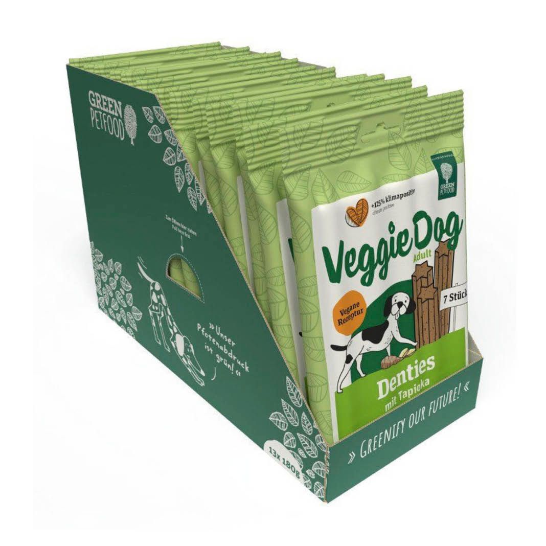 Was Zahnpflege und Weltrettung vereint? Unsere neuen Green Petfood VeggieDog Denties für Deine Fellnase! Die getreidefreien Dentasticks sind die perfekte Ergänzung zu unserem beliebten VeggieDog – was ihnen auch zu ihrem Namen verholfen hat. Das Besondere: Die Denties sind sogar 100 % vegan! Wir haben sie gemeinsam mit Ernährungswissenschaftler:innen und Tierärzt:innen entwickelt – in Deutschland und nur mit allerbesten Zutaten. Heraus kam ein grüner Superheld, der mit seiner sternförmigen Struktur das Kauen fördert und sich dank Cellulose hervorragend zur Unterstützung der täglichen Zahnhygiene eignet – Zahnfleischmassage inklusive!