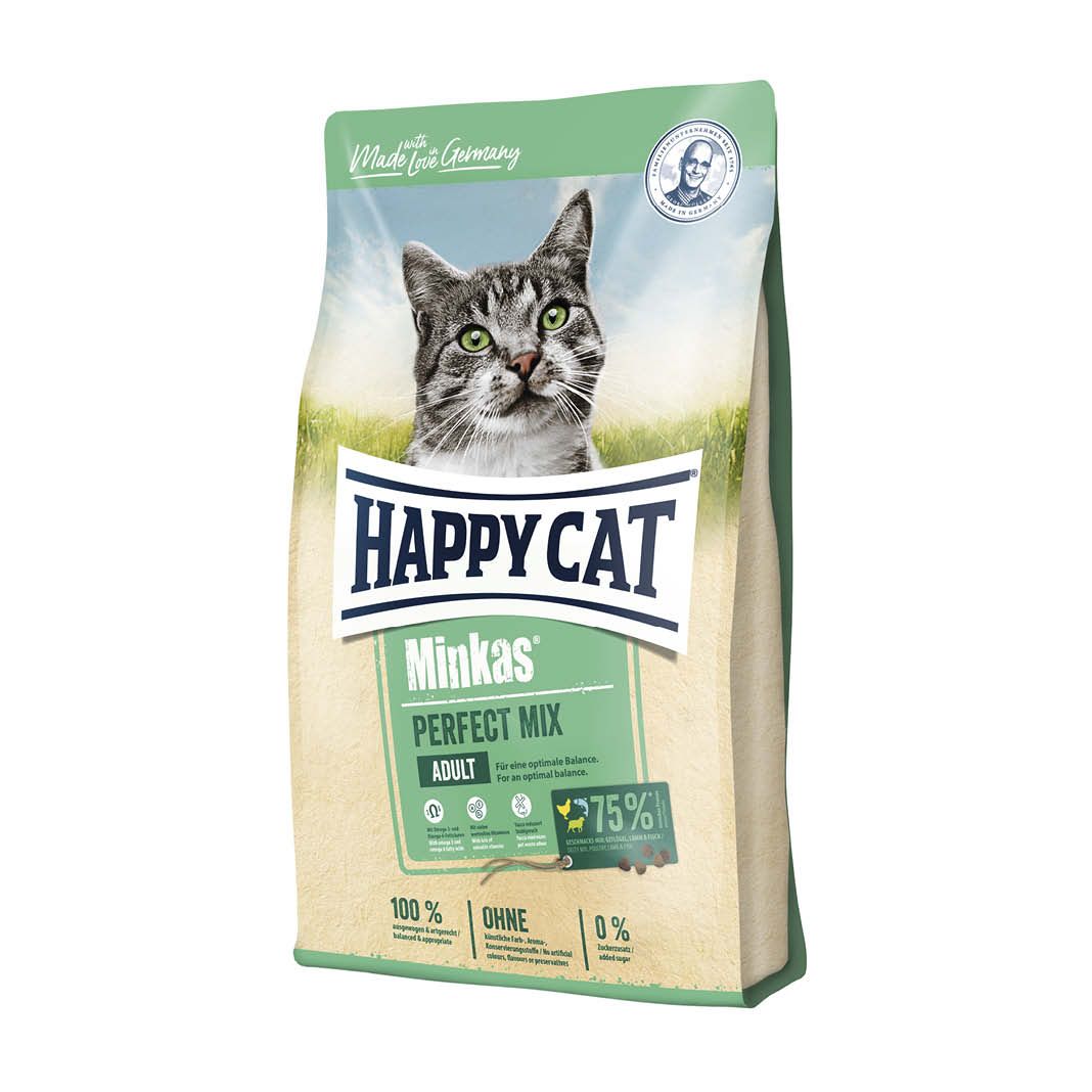 Happy Cat Minkas Perfect Mix ist eine besonders ausgewogene Komplettnahrung für ausgewachsene Katzen. Wertvolle tierische Proteine von Geflügel, Lamm und Fisch sowie hoch verdauliche Ballaststoffe verleihen diesem äußerst schmackhaften Kroketten-Mix eine hohe Akzeptanz und beste Verträglichkeit. Hergestellt in Deutschland unter strenger Qualitätskontrolle.