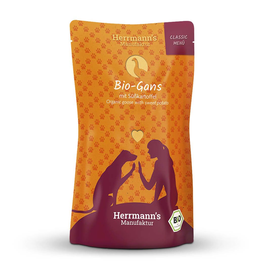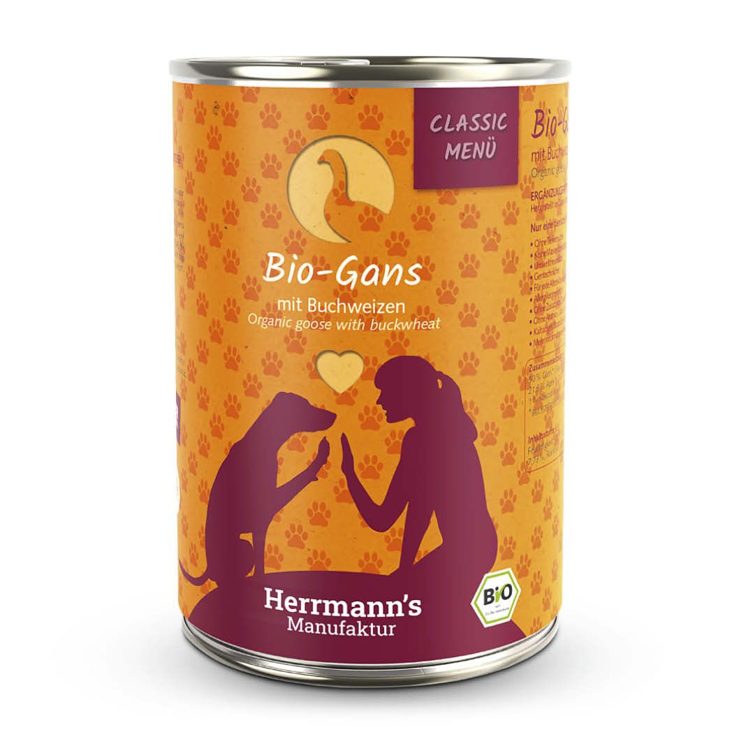 50,00 % Gans* (Fleisch, Karkasse, Herz, Hals, Leber), 20,20 % Kochsud*, 19,30 % Zucchini*, 10,00 % Süßkartoffel*, 0,50 % Leinöl* *aus kontrolliert biologischer Erzeugung.