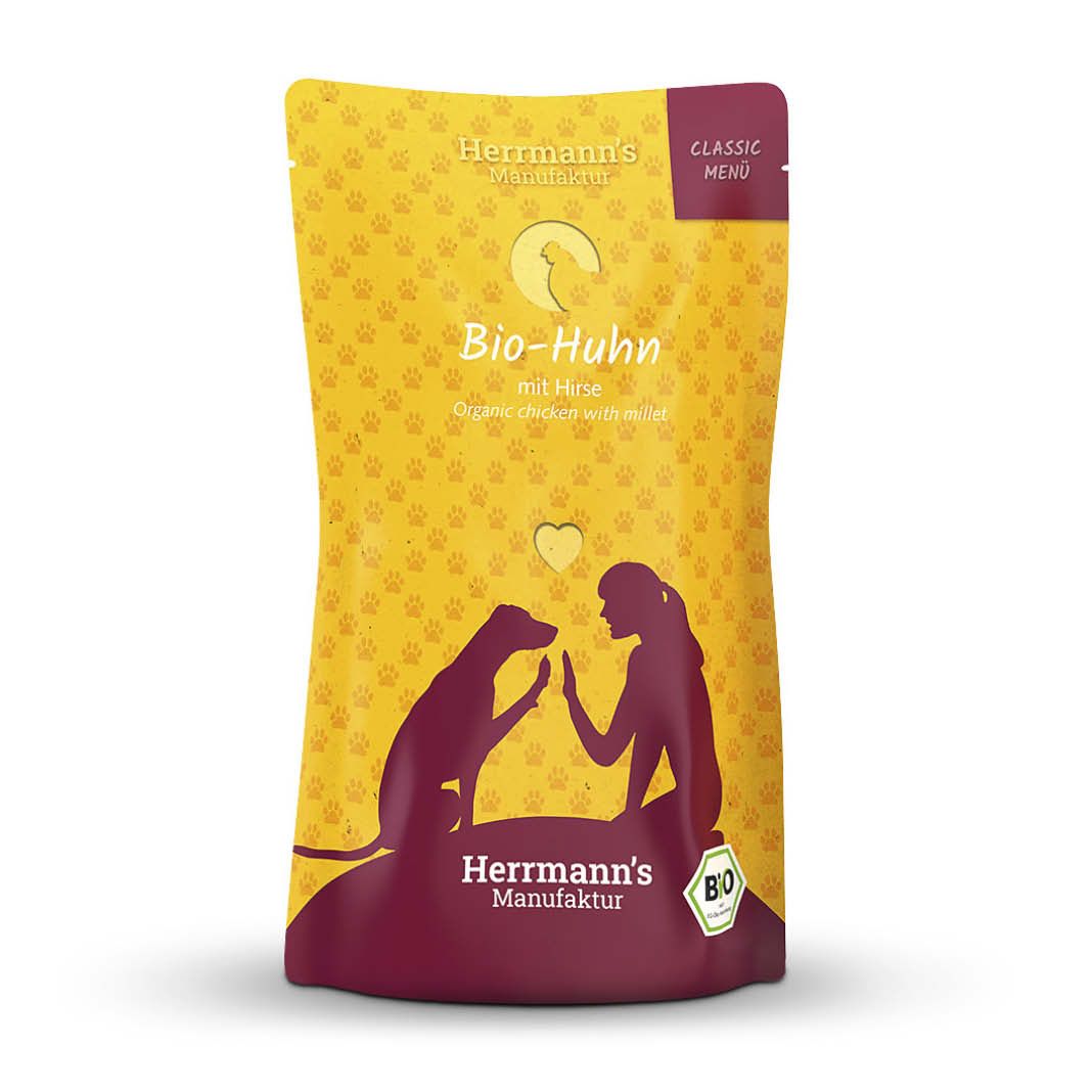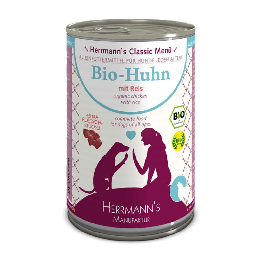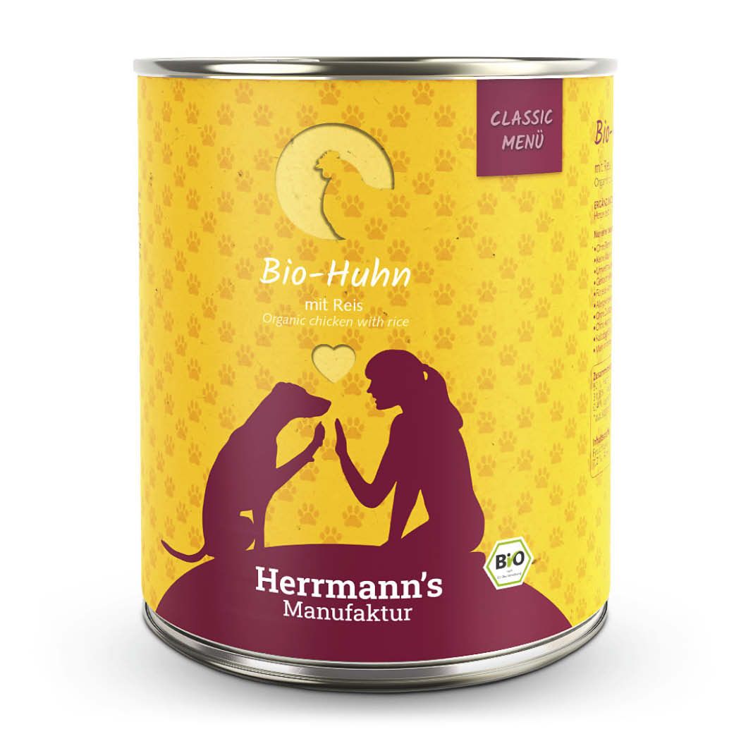 50,00 % Huhn* (Fleisch, Karkasse, Herz, Hals, Leber), 21,50 % Kochsud*, 10,00 Kürbis*, 10 % Zucchini*, 8 % Hirse*, 0,5 % Leinöl* *aus kontrolliert biologischer Erzeugung.