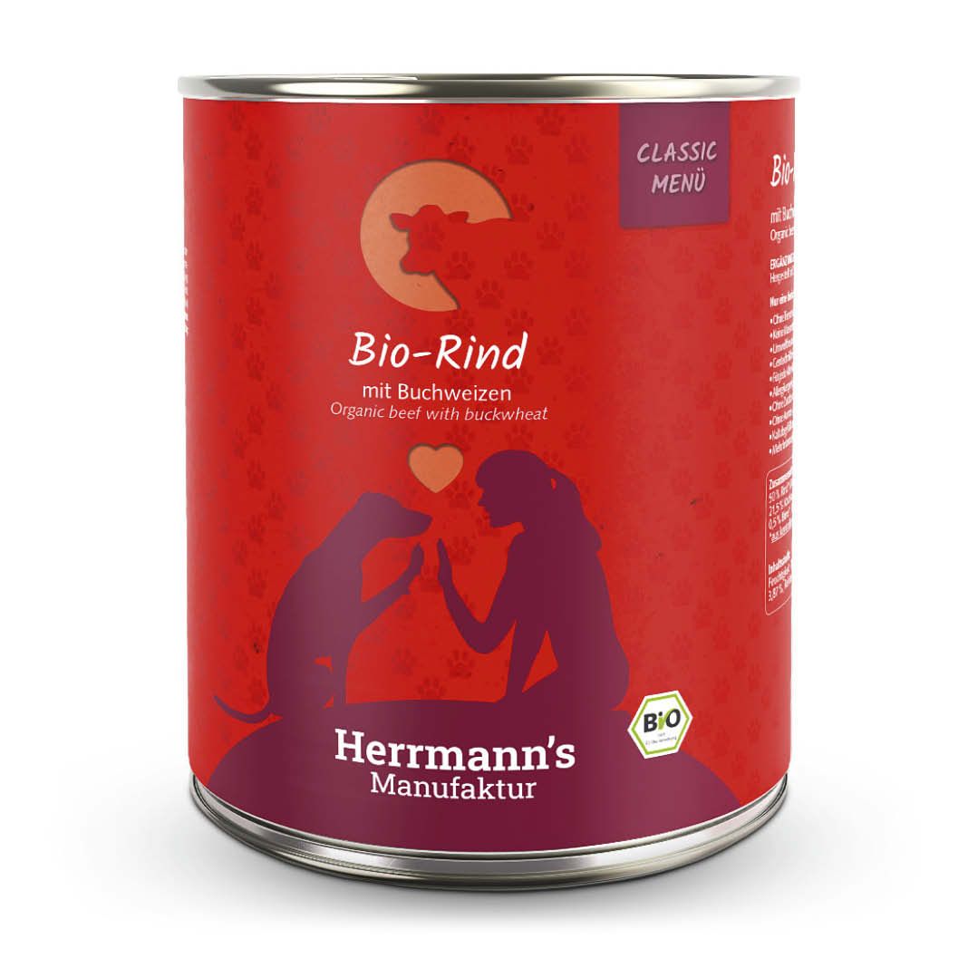 50,00 % Rind* (Muskelfleisch, Herz, Lunge, Leber), 21,50 % Kochsud*, 19,50 % Apfel*, 8,00 % Buchweizen*, 0,50 % Birne*, 0,50 % Leinöl* *aus kontrolliert biologischer Erzeugung.