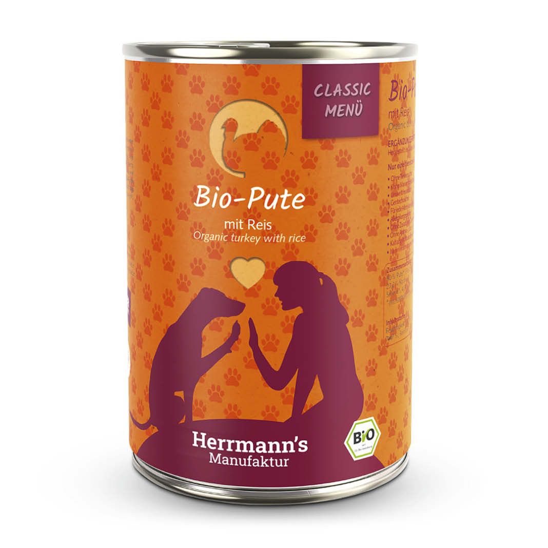50,00 % Pute* (Fleisch, Karkasse, Herz, Hals, Leber), 23,20 % Kochsud*, 10,00 % Karotte*, 7,00 % Reis*, 5,00 % Sellerie*, 4,30 % Fenchel*, 0,50 % Leinöl* *aus kontrolliert biologischer Erzeugung.