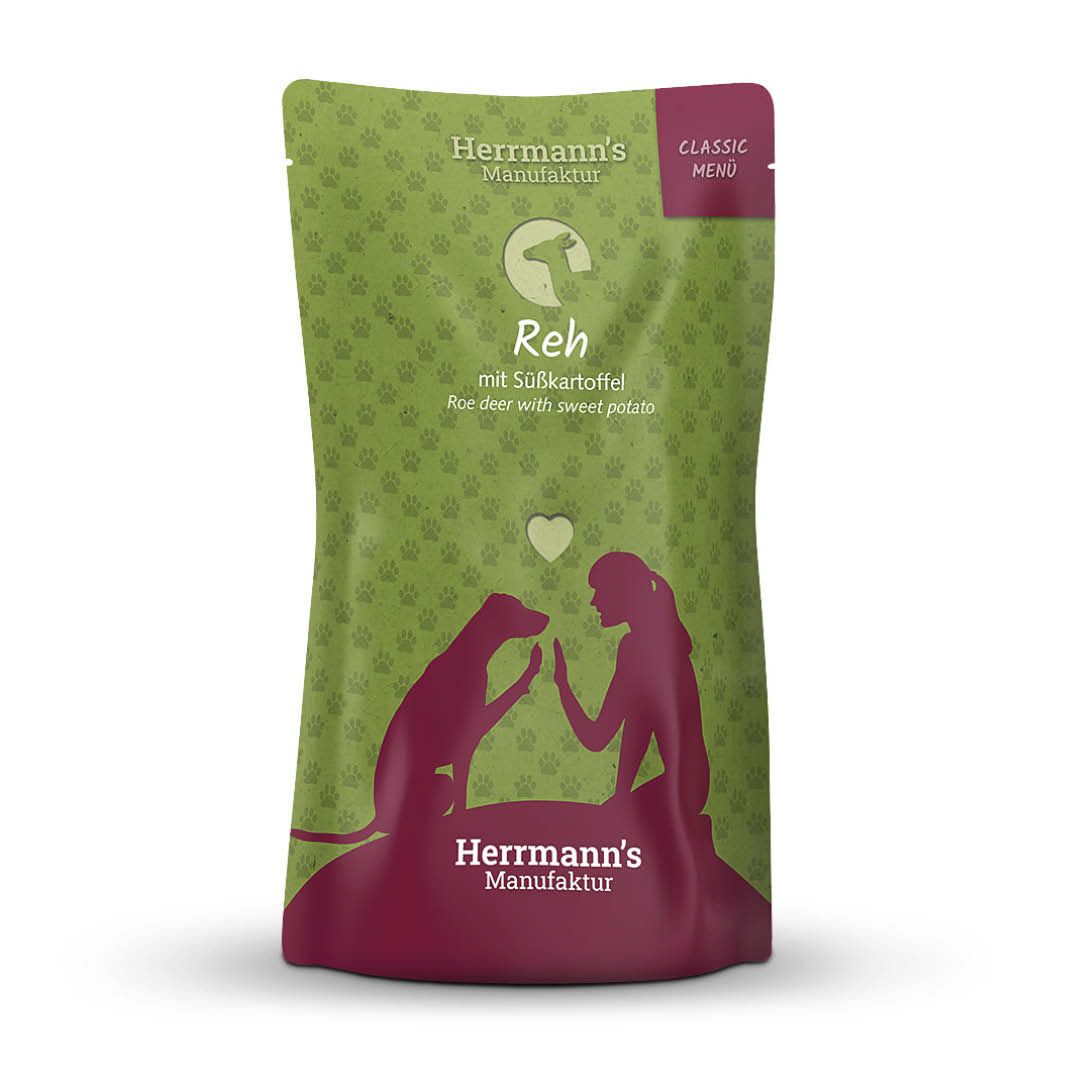 50,00 % Reh (Muskelfleisch, Herz, Lunge, Leber), 26,20 % Süßkartoffel*, 22,80 % Kochsud*, 0,50 % Früchte* (Beeren-Mix), 0,50 % Leinöl* *aus kontrolliert biologischer Erzeugung, davon Gesamtanteil 50,00 %.