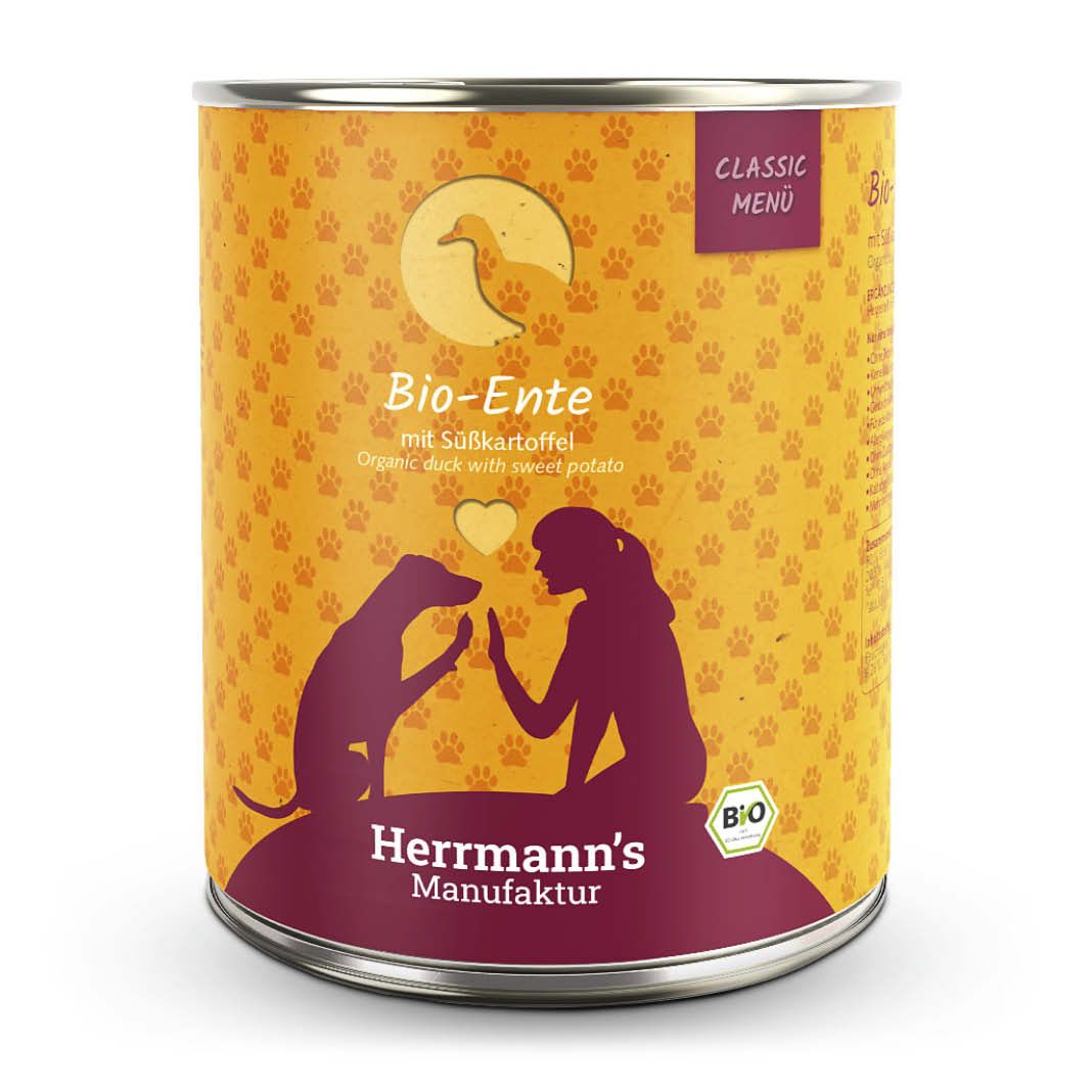 50,00 % Ente* (Fleisch, Karkasse, Herz, Hals, Leber), 20,50 % Kochsud*, 19,00 % Kürbis*, 10,00 % Süßkartoffel*, 0,50 % Leinöl* *aus kontrolliert biologischer Erzeugung.
