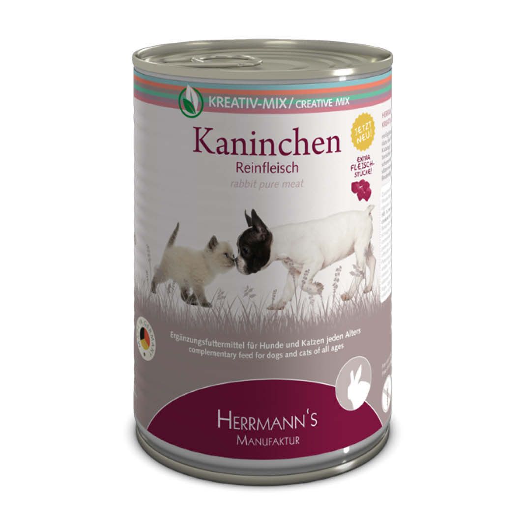 100 % Kaninchen (65 % Muskelfleisch, 25 % Herz, 10 % Lunge), im eigenen Saft gegart