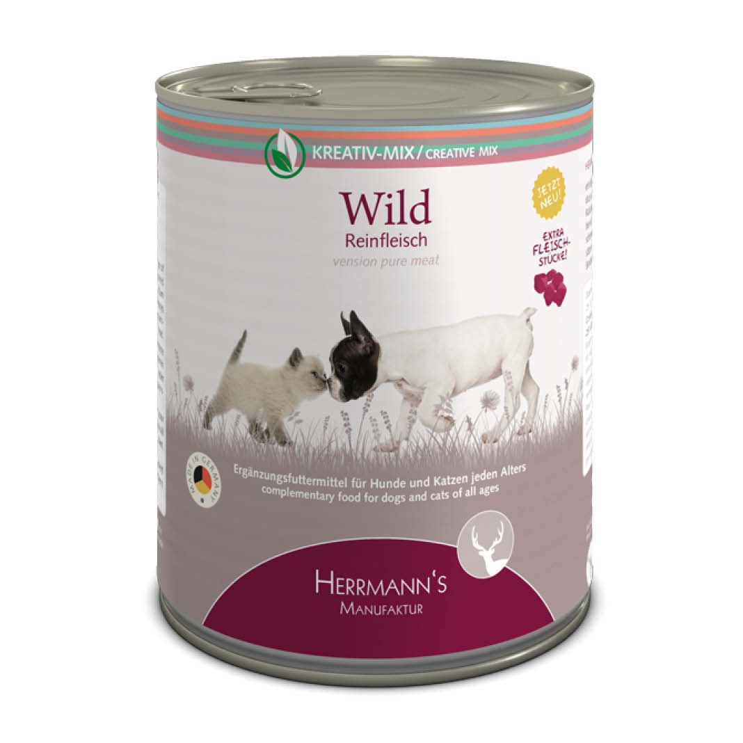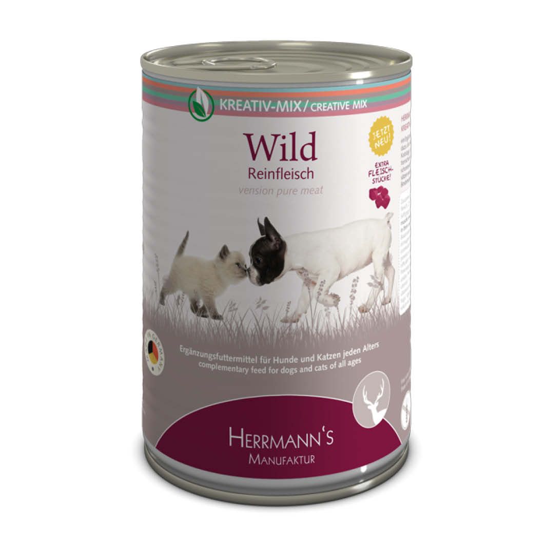100 % Wild (65 % Muskelfleisch, 25 % Herz, 10 % Lunge), im eigenen Saft gegart