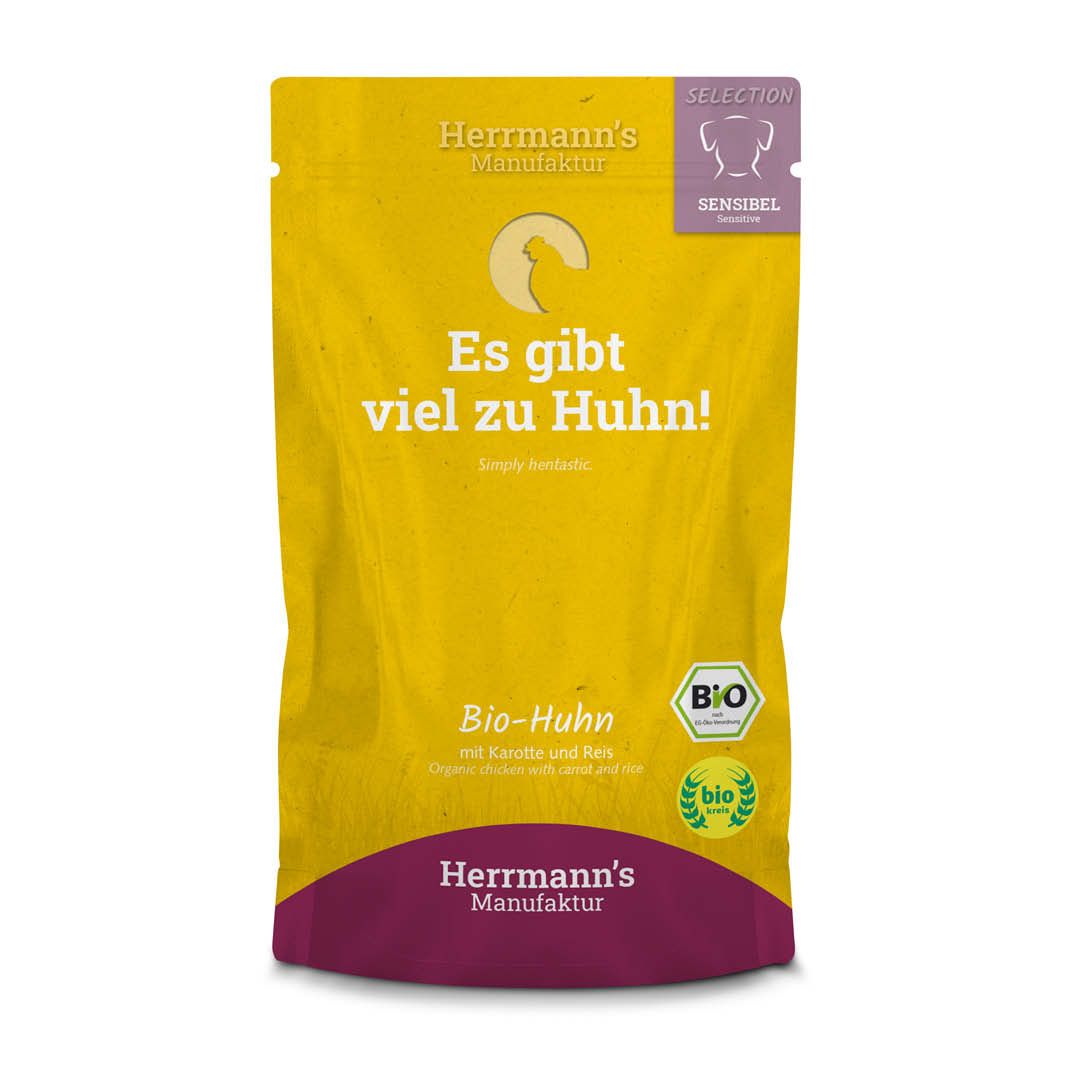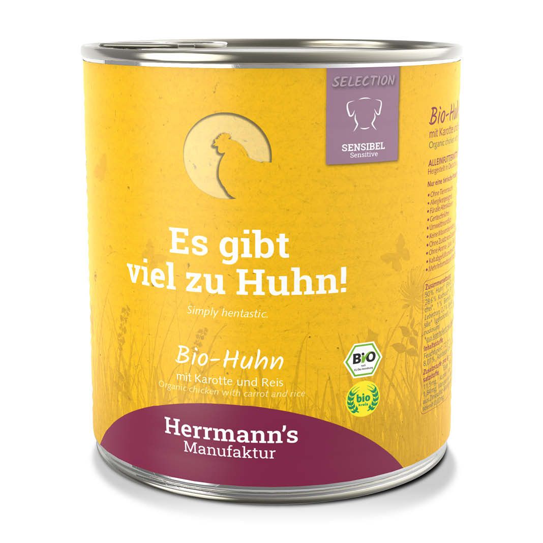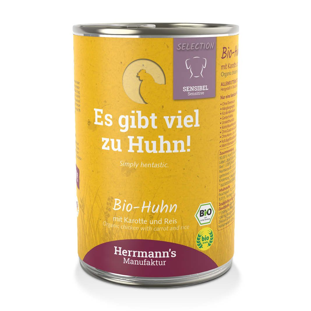 50 % Huhn* (Fleisch, Karkasse, Herz, Hals, Leber), 28,6 % Kochsud*, 8 % Karotte*, 8 % Reis*, 3 % Fenchel*, 1 % Bierhefe, 0,7 % Nachtkerzenöl*, 0,3 % Lebertran, 0,2 % Basilikum* (getrocknet), 0,1 % Petersilie* (getrocknet), 0,1 % Knotentang* (Ascophyllum nodosum) * aus kontrolliert biologischer Erzeugung