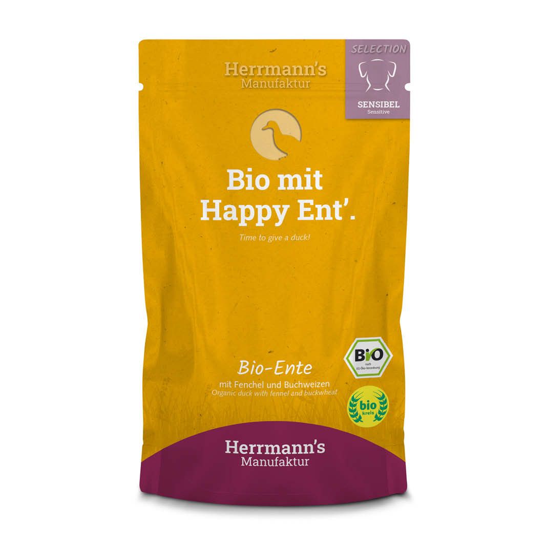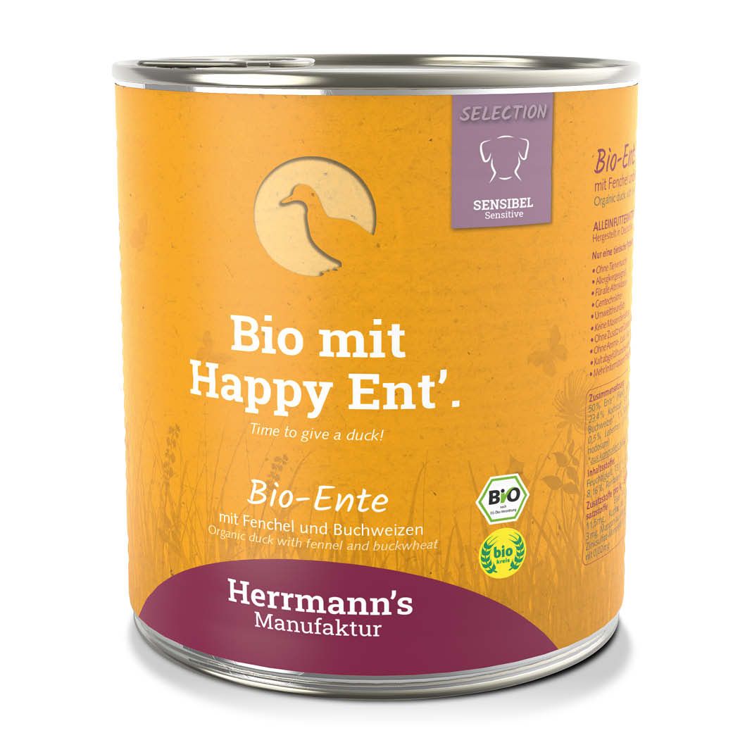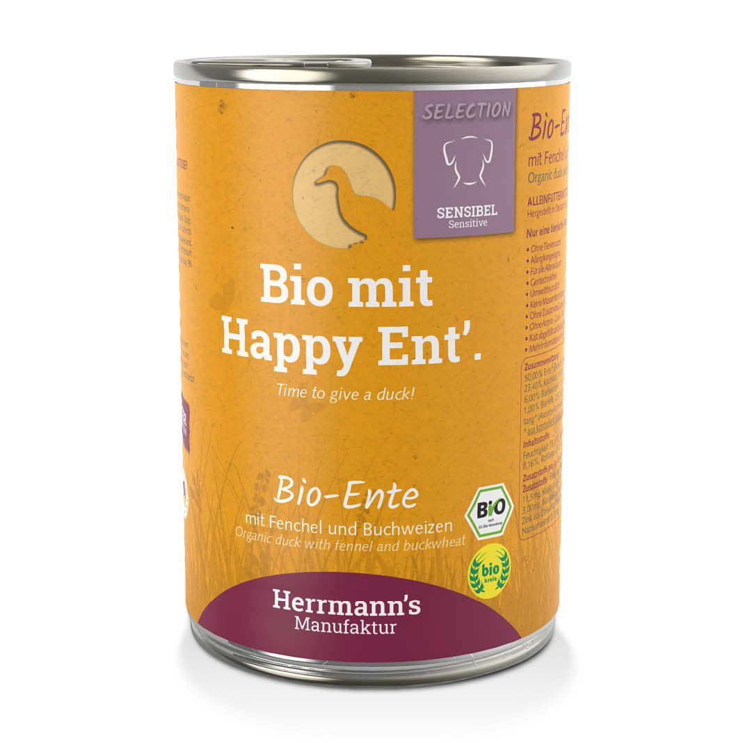 50 % Ente* (Fleisch, Karkasse, Herz, Hals, Leber), 23,4 % Kochsud*, 9 % Fenchel*, 9 % Apfel*, 6 % Buchweizen*, 1 % Sonnenblumenöl*, 1 % Bierhefe, 0,5 % Lebertran, 0,1 % Knotentang* (Ascophyllum nodosum) * aus kontrolliert biologischer Erzeugung