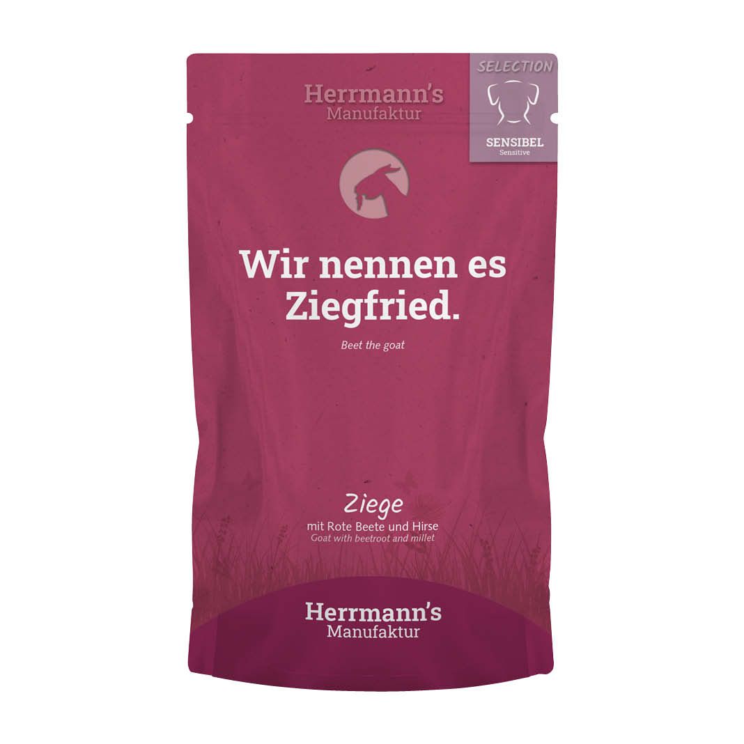50 % Ziege (Muskelfleisch, Lunge, Herz, Leber), 24,1 % Kochsud*, 7 % Rote Beete*, 6 % Hirse*, 5 % Kürbis*, 5 % Apfel*, 1 % Bierhefe, 1 % Nachtkerzenöl*, 0,3 % Algenkalk, 0,3 % Lebertran, 0,2 % Schwarzkümmel* (Samen), 0,1 % Knotentang* (Ascophyllumnodosum) * aus kontrolliert biologischer Erzeugung, davon Gesamtanteil 48,4 %
