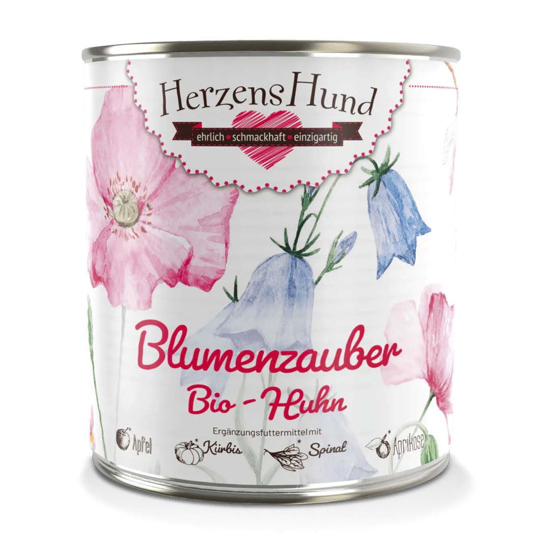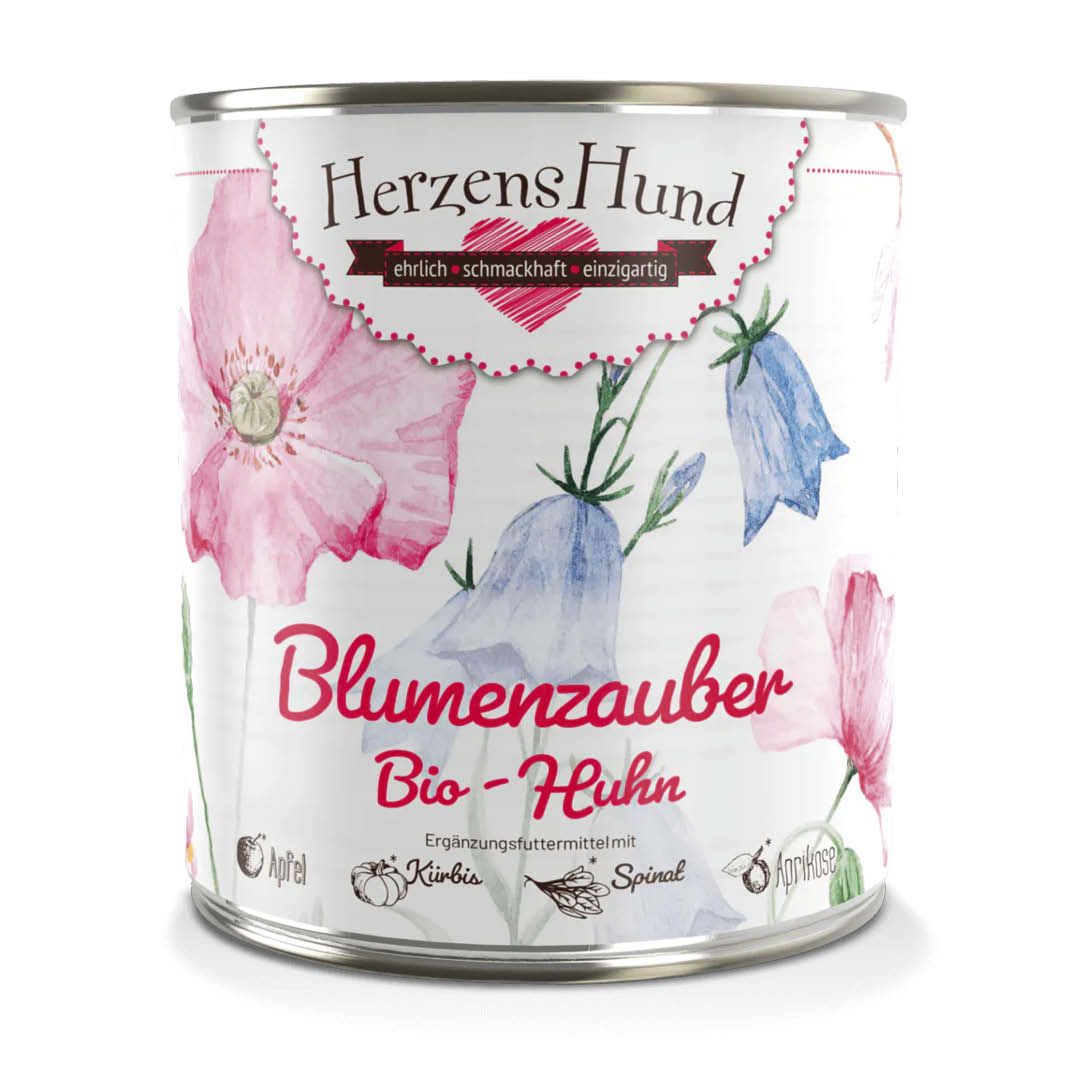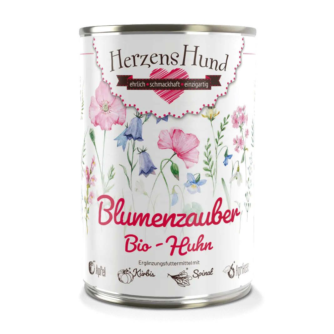Leichtes und gut bekömmliches Huhn trifft im Blumenzauber auf das Power-Paket Apfel, auf Kürbis mit Carotin sowie auf Spinat, der besonders reich an B-Vitaminen ist. Verzaubert werden diese durch Blütenpollen: Pollen werden aus dem männlichen Teil einer Blume hergestellt. Bienen sammeln Pollen und fügen Honig oder Nektar hinzu, wodurch sich Körner bilden. Die Pollen werden von verschiedenen Blumenarten gesammelt. Die Bienen nutzen die Blütenpollen zur Aufzucht ihres Nachwuchses, denn Blütenpollen sind sehr reich an Eiweiß (etwa 25 %) sowie an Vitaminen und Mineralien. Wir achten auf einen hohen Fleischanteil und legen Wert auf hochwertiges Brustfleisch mit wertvollen Proteinen. Als Vitamin-Booster bieten Herz und Leber viel Vitamin A und B-Vitamine sowie Aminosäuren, Karkasse und Hälse liefern Calcium.