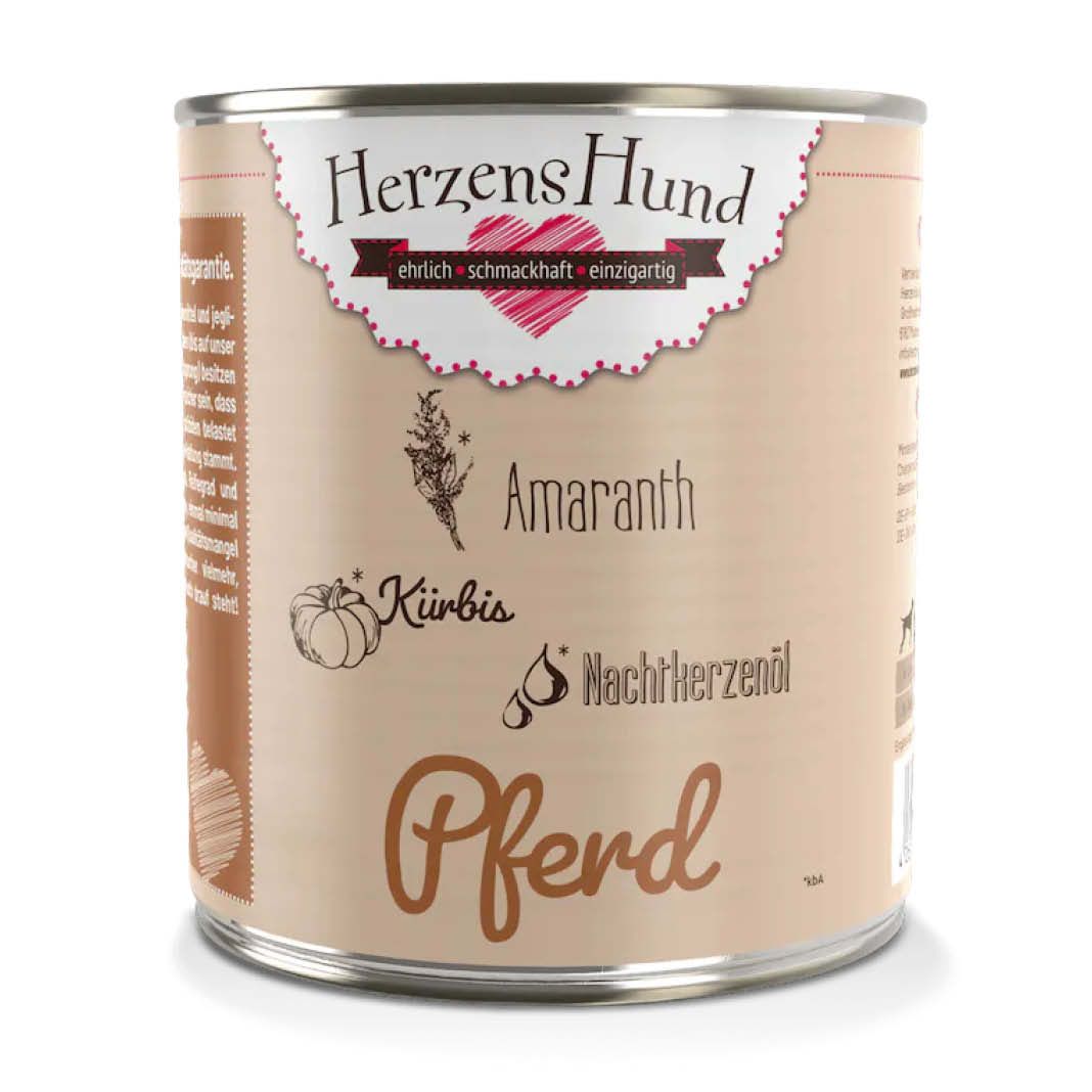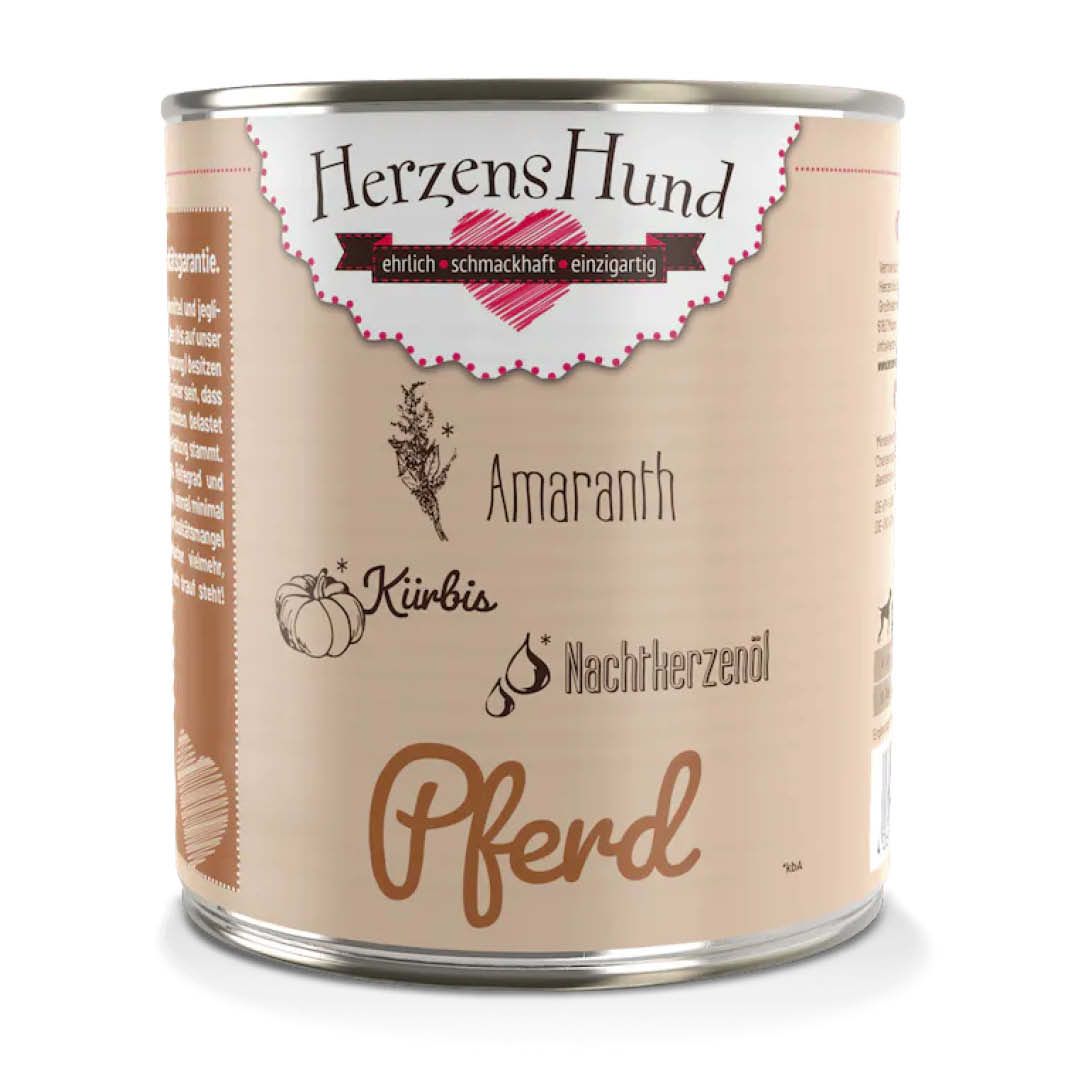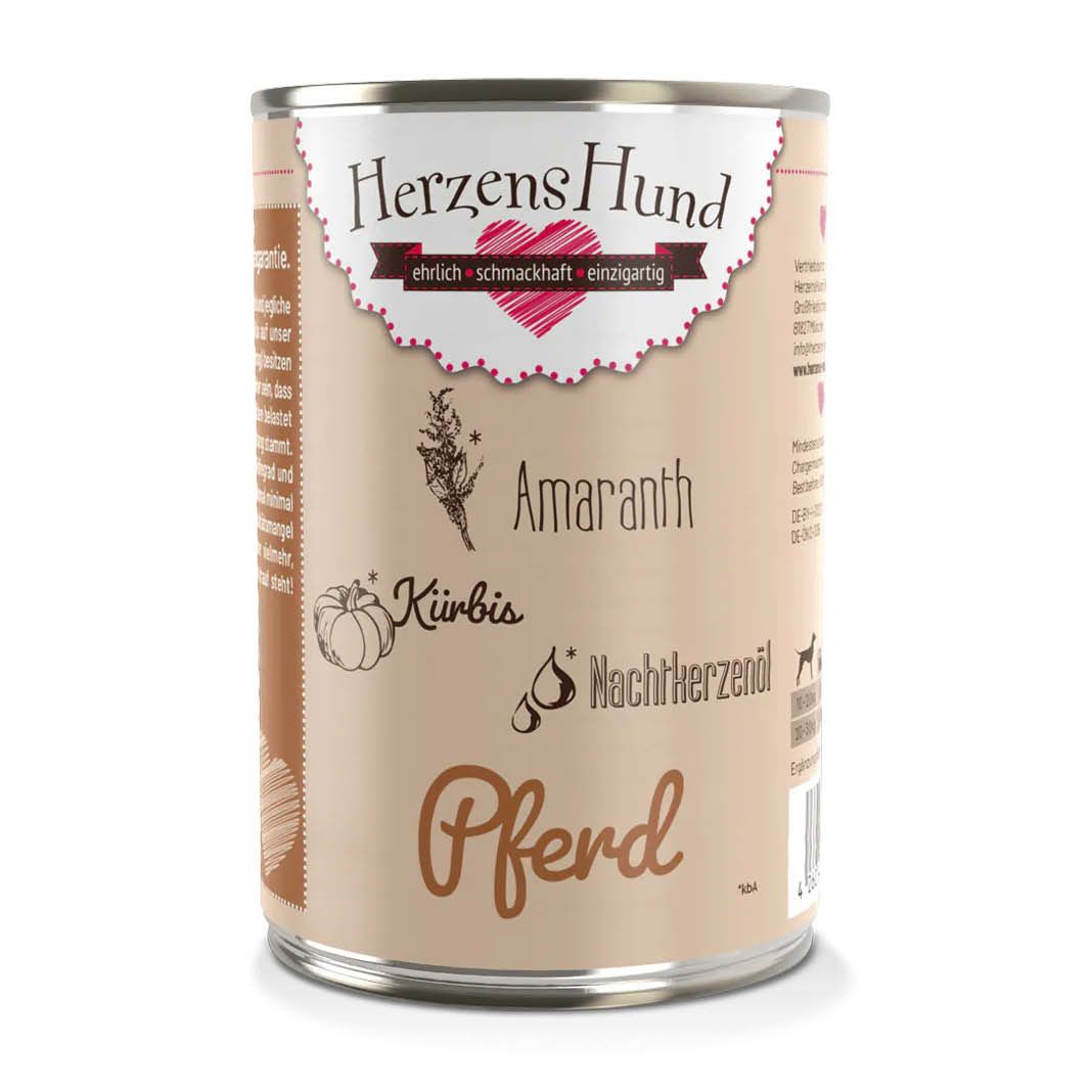 Pferd ist oft für allergiegeplagte Hunde der letzte Ausweg und eine sehr bekömmliche Proteinquelle. Bei der Zusammensetzung des Fleischanteils steht hochwertiges Muskelfleisch ganz vorne, das wichtige Proteine bietet. Doch auch Herz und Leber sorgen für einen Vitamin-Boost mit viel Vitamin A und B-Vitaminen sowie Aminosäuren. Für die Sensiblen haben wir die Zutatenliste bei diesem Menü extra kurz gehalten; abgerundet wurde der hohe Fleischanteil mit nährstoffreichem Kürbis. Nachtkerzenöl mit Omega-6-Fettsäuren kann Fell und Haut guttun.