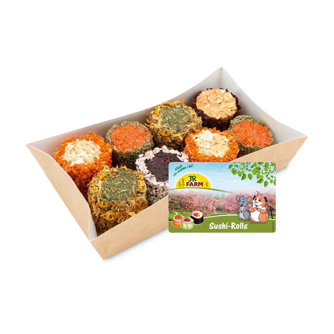 In einer Naturschale warten 8 delikate Leckereien darauf, unsere geliebten Kleinsäuger zu verwöhnen. Die schmackhaften, natürlich umhüllten Sushi-Rolls bestehen aus gepresstem Gemüse, wertvollen Blüten und Kräutern und vewöhnen die Tiere mit vielen, wohltuenden Inhaltsstoffen. Egal ob das Sushi aus Petersilie dragiert mit Ringelblume, Erbse & Zucchini mit Karotte, Karotte mit Petersilie, Rote Beete mit Kokosflocken oder Pastinake umhüllt mit Roter Beete gemacht ist. Bei dieser bunten Auswahl findet jeder Nager bestimmt schnell seinen persönlichen Favoriten.