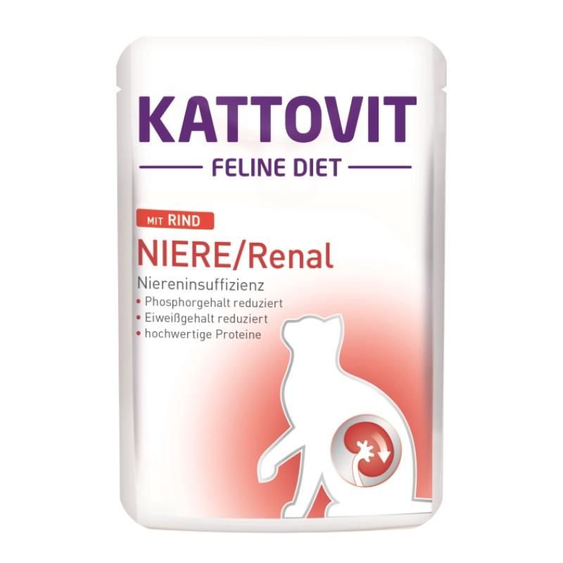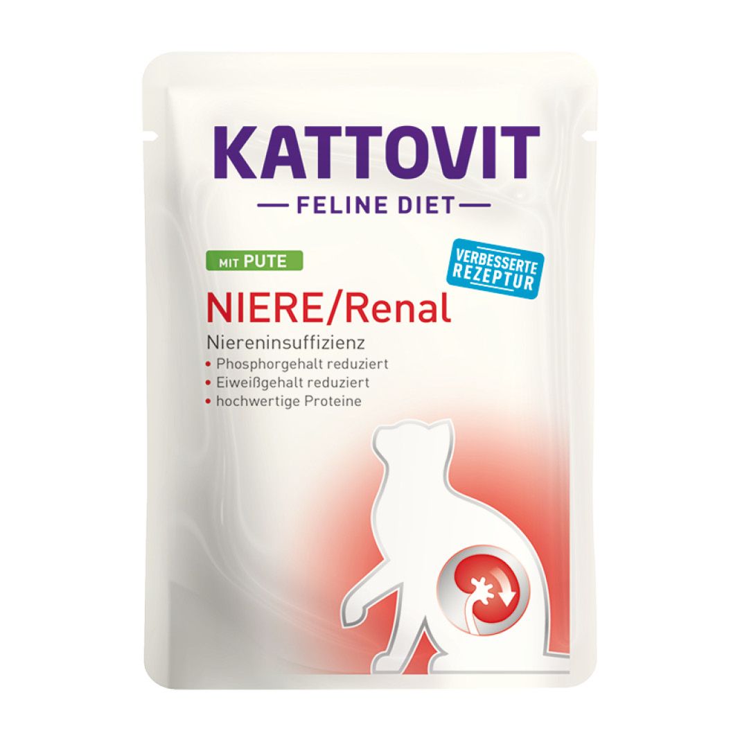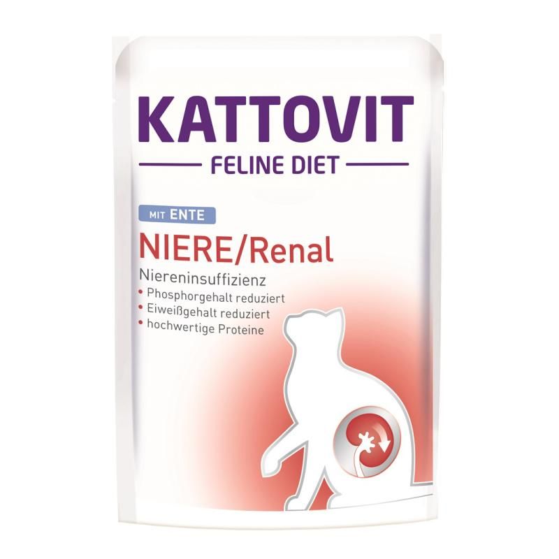 Kattovit Feline Diet - NIERE/RENAL wurde speziell entwickelt, um die Katzen mit einem reduzierten Eiweißgehalt zu versorgen, durch die Verwendung von hochwertigem Protein in einer leicht verdaulichen Zusammensetzung. Hohe Eiweißgehalte können sich schädigend auf die Nieren auswirken. Entscheidend ist dabei der Proteingehalt bezogen auf die Energiemenge. Bei Kattovit NIERE/RENAL wird, im Gegensatz zu herkömmlichem Futter, nur etwa die Hälfte der Energie durch Eiweiß erbracht. Die Anreicherung mit Kaliumcitrat sorgt für einen weniger sauren Urin (neutral) und kann somit der Oxalat-Kristallbildung vorbeugen (Oxalatprophylaxe). Die Gehalte an Phosphor und Natrium sind reduziert.