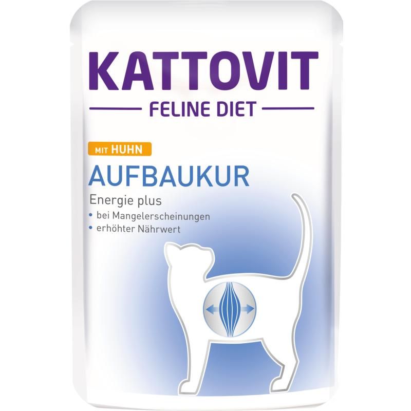Aufbaukur mit Huhn - Zur geeigneten Ernährung von unterernährten Katzen, bei Mangelerscheinungen und akuten oder chronischen Erkrankungen, wie Trauma, Sepsis, Tumoren, Verbrennungen und massiven Parasitenbefall. Kattovit bietet hier mit der Aufbaukur eine wissenschaftlich entwickelte Vollnahrung, die wegen der leichteren Verdaulichkeit ausschließlich als Nassfutter angeboten wird. Bei dieser Kost wird die Katze mit einem besonders hohen Energiegehalt versorgt. Sowohl Proteine wie auch Mineralstoffe sind erhöht. Dieser erhöhte Nährwert ist wichtig für geschwächte Katzen in der Rekonvaleszenz (z.B. zum Knochenaufbau), aber auch bei besonders aktiven Katzen. Auch trächtige Katzen bzw. Katzen während der Wachstumsphase werden so optimal unterstützt.