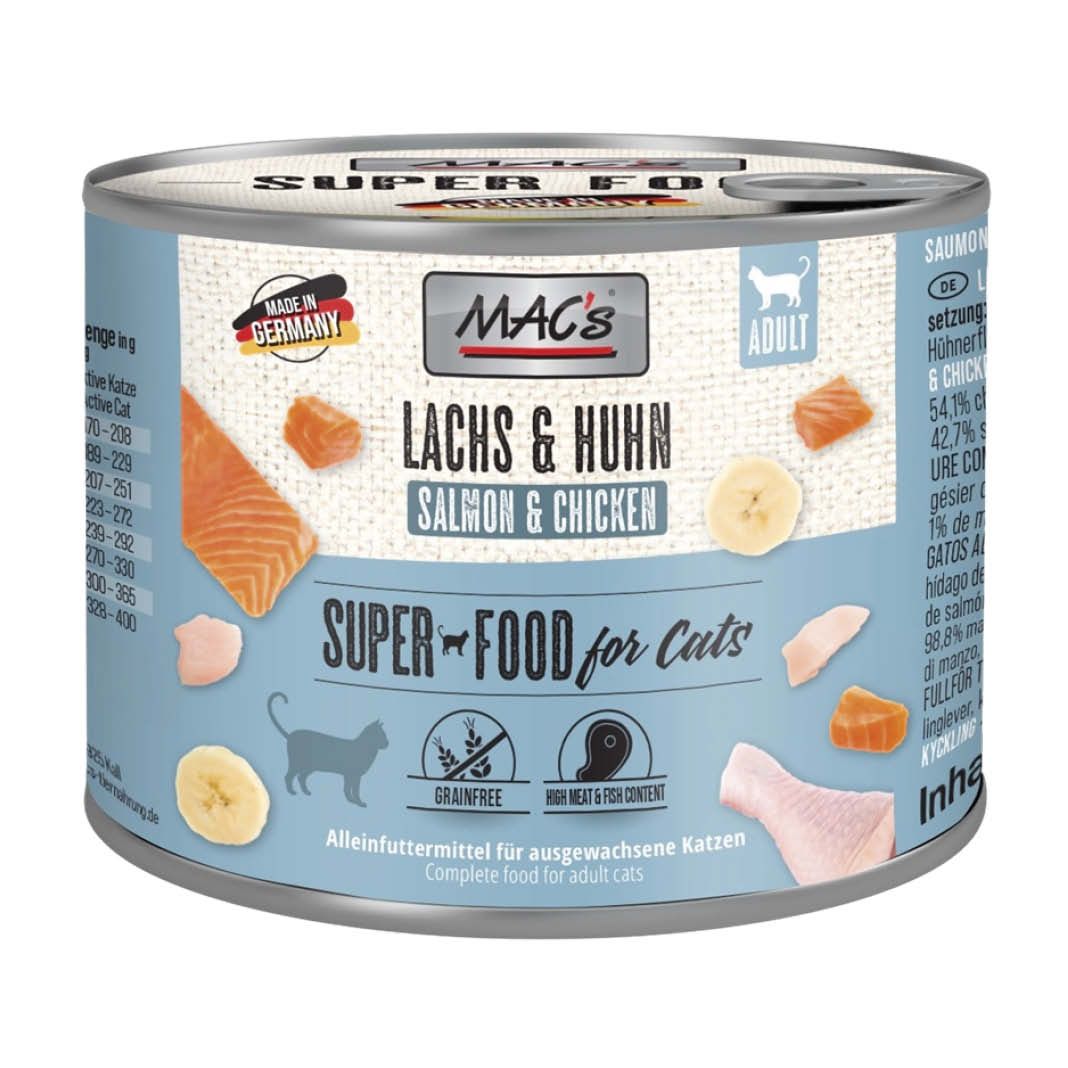 MAC’s Cat Lachs & Huhn wird von Katzen geliebt, da es eine besonders schmackhafte Kombination ist. Abgerundet wird das Geschmackserlebnis von fruchtigen Bananenhäppchen und Lachsöl, ein wichtiger Lieferant an ungesättigten, essentiellen Fettsäuren, die für den Stoffwechsel sowie für Haut und Fell von großer Bedeutung sind. Die besondere Rezeptur ist getreidefrei und wurde als ausgewogene Vollnahrung entwickelt. Durch schonende Zubereitung und die Zugabe von Vitaminen und Mineralstoffen wird eine naturnahe Ernährung Ihrer Katze erreicht.