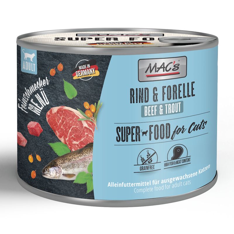 MAC´s Rind & Forelle bietet Ihrer Katze die ideale Mischung aus Fleisch und Fisch. Kombiniert mit Sanddorn und Brennnesselblättern wird diese Sorte Ihrer Katze besonders gut schmecken.