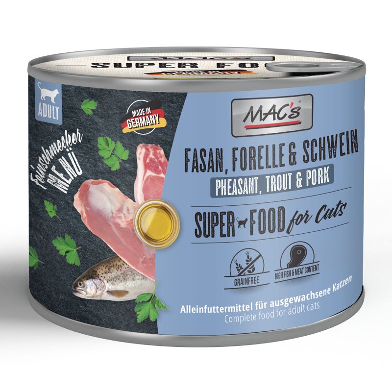 MAC´s Fasan, Forelle & Schwein ist besonders für Feinschmecker geeignet. Mit einem Fleisch- und Fischanteil von fast 99% ist die Sorte ein echtes Highlight für Ihre Samtpfote.