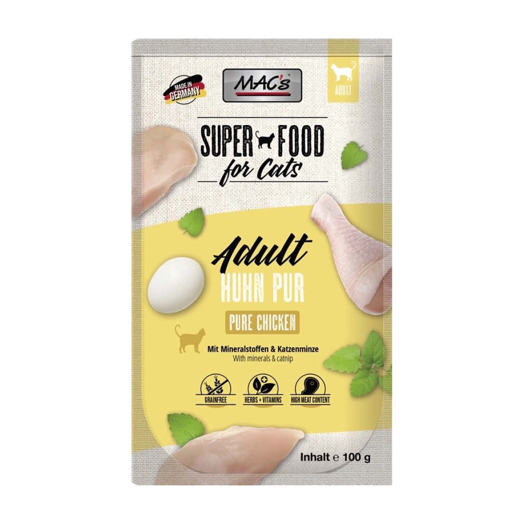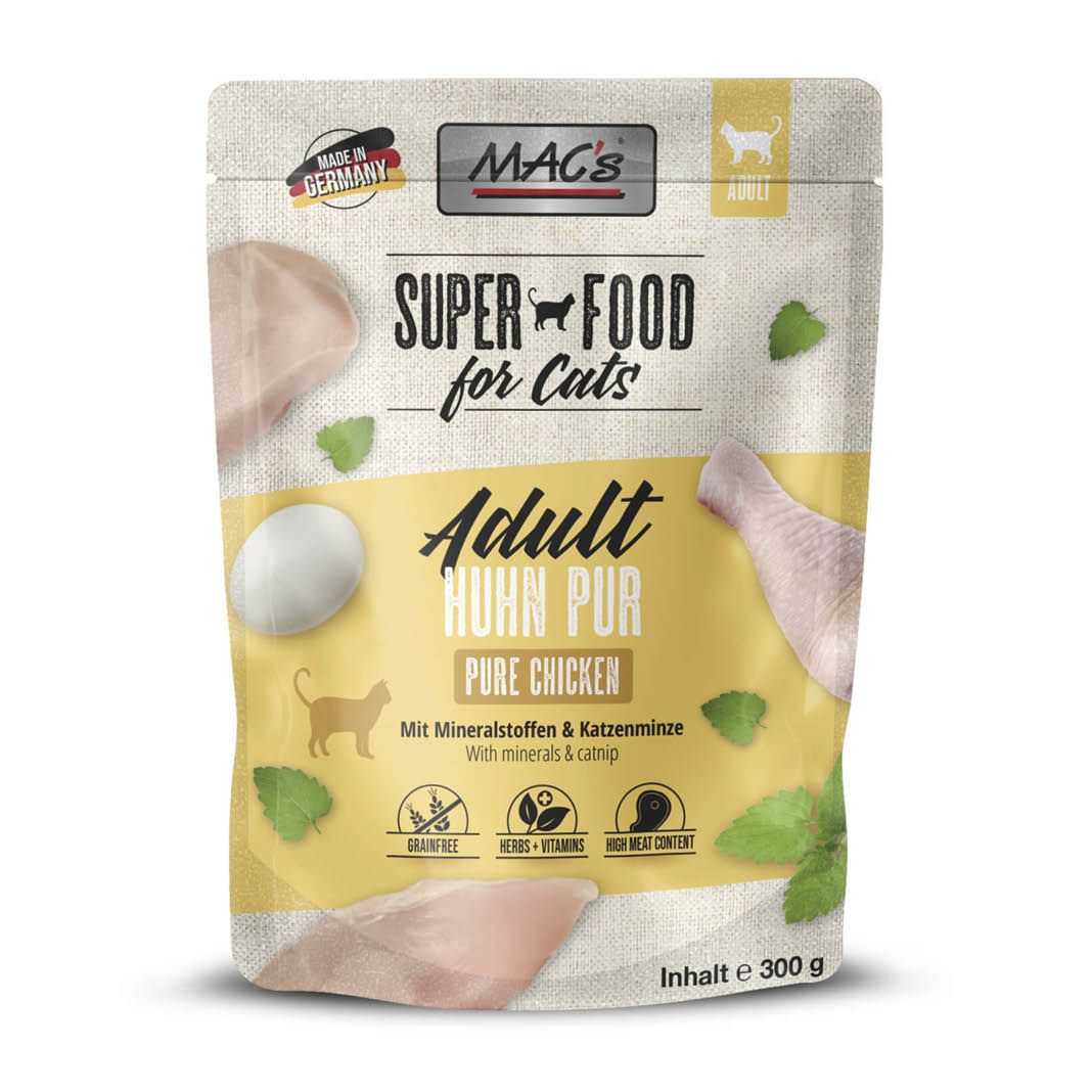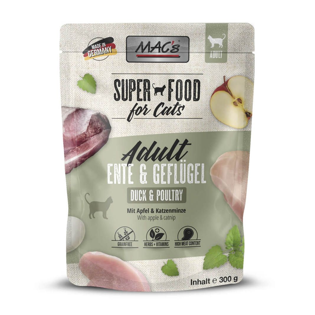 Im neuen Mac’s-Sortiment wurde besonderer Wert auf natürliche und gesunde Zutaten gelegt. Die Kombination mit verschiedenen Fleischsorten, einem Kräutermix sowie Apfel, Cranberry, Löwenzahn, Preiselbeeren oder Malz sorgen für einen besonderen Geschmack und garantieren die Gesundheit der Katze. Die dezenten Fleischstücke in Kombination mit dem Pâte/Gelee sorgen bei der Katze für ein besonderes Geschmackserlebnis. In allen Produkten wurde auf Konservierungsstoff sowie Akzeptanzverstärker wie Zucker, Salz sowie auf künstliche oder natürliche Farbstoffe verzichtet. Diese Vollnahrung besticht durch ihre Naturbelassenheit bei den verwöhnten Katzen. Der bequeme Pouchbeutel sorgt für eine saubere und optimale Futterzubereitung