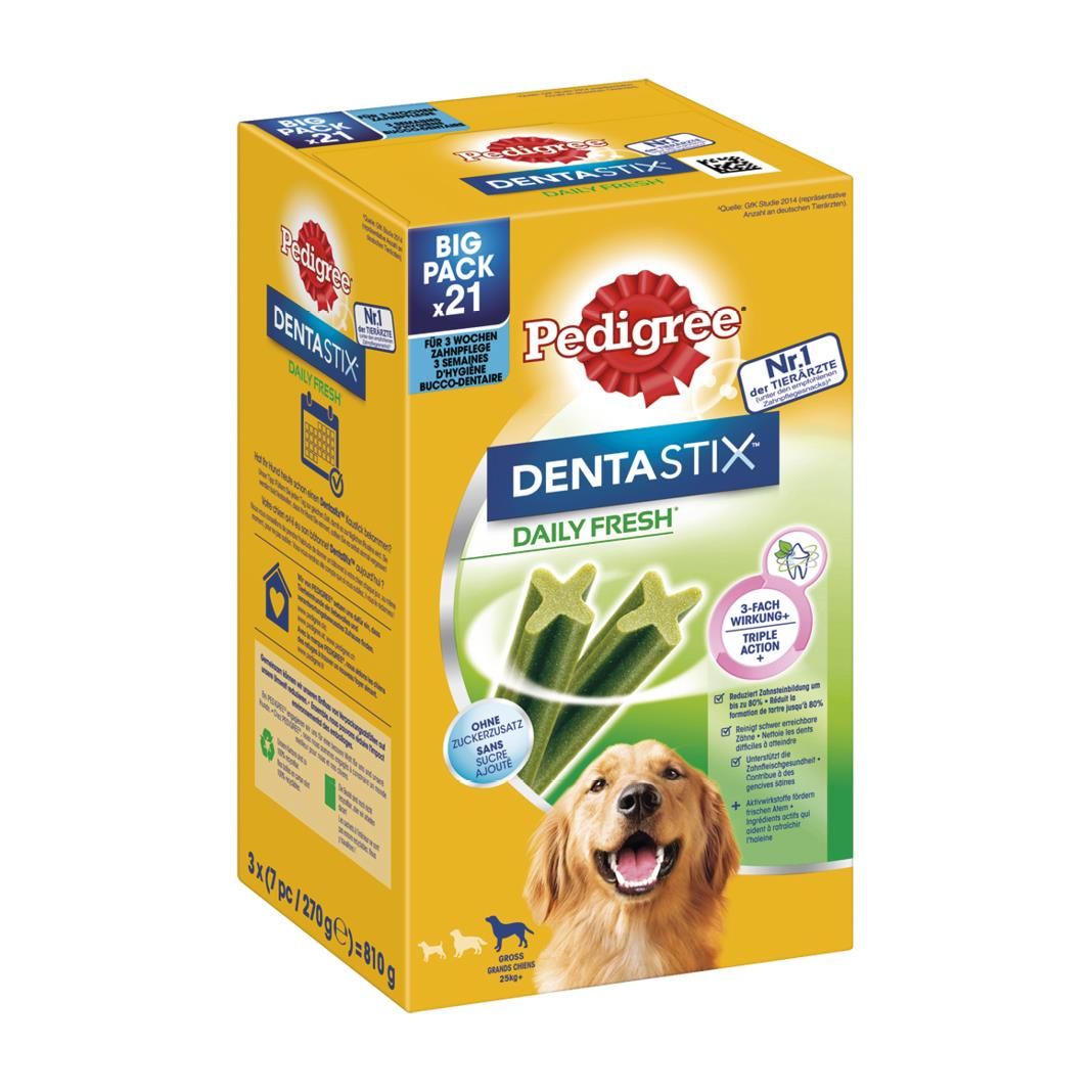 PEDIGREE® glaubt, dass Hunde unser Leben bereichern. Jeden Tag bringt ihr Wesen das Gute in uns zum Vorschein. Das komplette Sortiment von PEDIGREE® mit schmackhaftem und gesundem Hundefutter, sowie leckeren Kauknochen und Hundeleckerlis liefert alles, was Hunde brauchen, um ihr Leben in vollen Zügen zu genießen. Mit PEDIGREE® Hundefutter können Hundebesitzer ihren Hunden Tag für Tag etwas Gutes geben. PEDIGREE® DENTASTIX™ Daily Fresh sind für große Hunde ab 25 kg geeignet. Die speziellen Kauknochen für die tägliche Frische sind einzigartige X-förmige Zahnpflegeprodukte, die wissenschaftlich erwiesen dazu beitragen, die Bildung von Zahnstein bei täglicher Fütterung um bis zu 80% zu reduzieren. PEDIGREE® DENTASTIX™ Daily Fresh enthalten eine einzigartige Wirkstoffmischung aus Grüntee-Extrakt und patentiertem Eukalyptusöl, die nachweislich helfen, den Atem zu erfrischen. Sie sind lecker, fettarm und frei von künstlichen Farb- und Aromastoffen und haben keinen Zuckerzusatz. Ergänzungsfuttermittel für Hunde ab 4 Monaten.