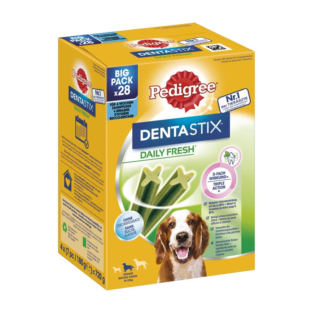 PEDIGREE® glaubt, dass Hunde unser Leben bereichern. Jeden Tag bringt ihr Wesen das Gute in uns zum Vorschein. Das komplette Sortiment von PEDIGREE® mit schmackhaftem und gesundem Hundefutte sowie leckeren Kauknochen und Hundeleckerlis liefert alles, was Hunde brauchen, um ihr Leben in vollen Zügen zu genießen. Mit PEDIGREE® Hundefutter können Hundebesitzer ihren Hunden Tag für Tag etwas Gutes geben. PEDIGREE® DENTASTIX™ Daily Fresh sind für mittelgroße Hunde von 10 bis 25 kg geeignet. Die speziellen Kauknochen für die tägliche Frische sind einzigartige X-förmige Zahnpflegeprodukte, die wissenschaftlich erwiesen dazu beitragen, die Bildung von Zahnstein bei täglicher Fütterung um bis zu 80% zu reduzieren. PEDIGREE® DENTASTIX™ Daily Fresh enthalten eine einzigartige Wirkstoffmischung aus Grüntee-Extrakt und patentiertem Eukalyptusöl, die nachweislich helfen, den Atem zu erfrischen. Sie sind lecker, fettarm und frei von künstlichen Farb- und Aromastoffen und haben keinen Zuckerzusatz.