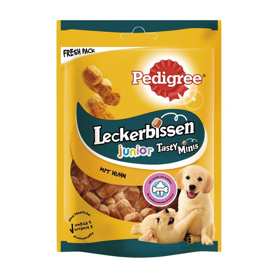 PEDIGREE® glaubt, dass Hunde unser Leben bereichern. Jeden Tag bringt ihr Wesen das Gute in uns zum Vorschein. Das komplette Sortiment von PEDIGREE® mit schmackhaftem und gesundem Hundefutter sowie leckeren Kauknochen und Hundeleckerlis liefert alles, was Hunde brauchen, um ihr Leben in vollen Zügen zu genießen. Mit PEDIGREE® Hundefutter können Hundebesitzer ihren Hunden Tag für Tag etwas Gutes geben. Schmackhafte, mundgerechte Leckerlis für Hunde - PEDIGREE® Leckerbissen Junior sind weiche Häppchen, mit Kalzium angereichert, um die Entwicklung starker Zähne und Knochen zu unterstützen. Die schmackhaften Hundeleckerlis sind ideal fürs Training, als Belohnung oder einfach für einen Genussmoment zwischendurch. 125 g leckere Kau-Happen mit Huhn.