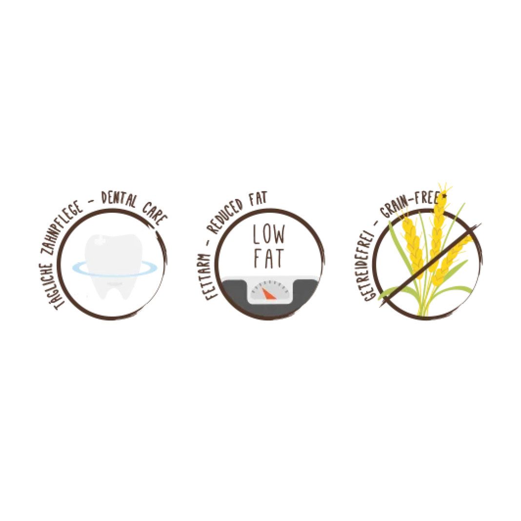 - Selbst bei größter Sorgfalt in der Herstellung und Verpackung unserer Produkte können Spuren anderer tierischer Proteinquellen oder (glutenhaltigem) Getreide nicht ausgeschlossen werden.